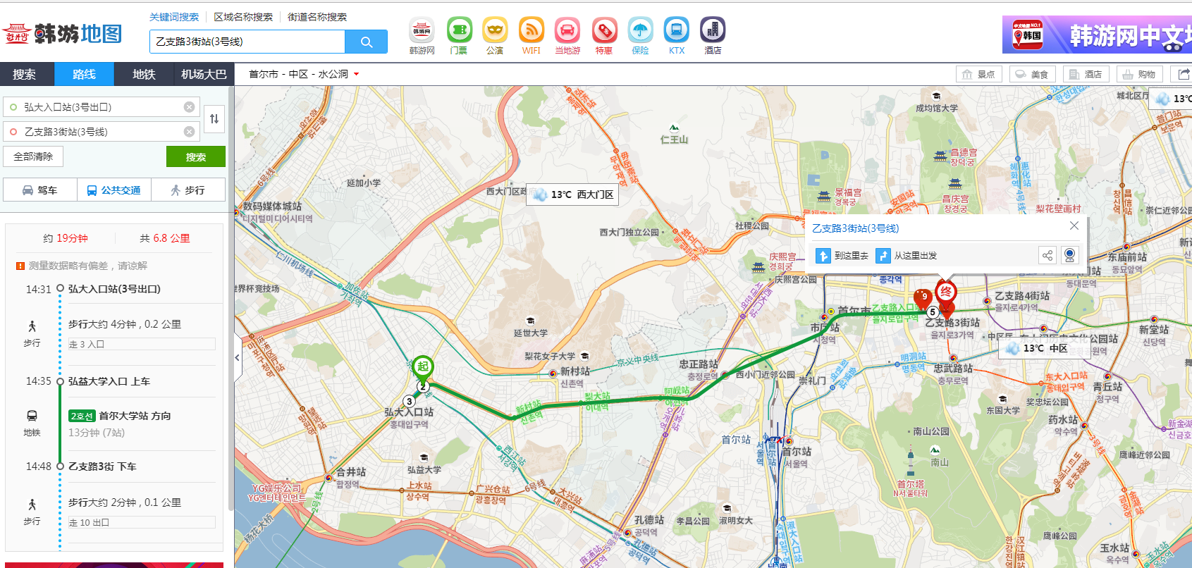 我是用移动wifi的,感觉也挺方便,可以几个人一起用从明洞打车去弘大15000韩币左右,做地铁的话10个站以内,不算很远,不过建议坐地铁,首尔堵车挺厉害的在首尔导航的话建议用google地图先定位比较准确,再用百度地图教你怎样用交通工具或者步行到达目的地(中文),naver也很多人用,不过没有...显示全部