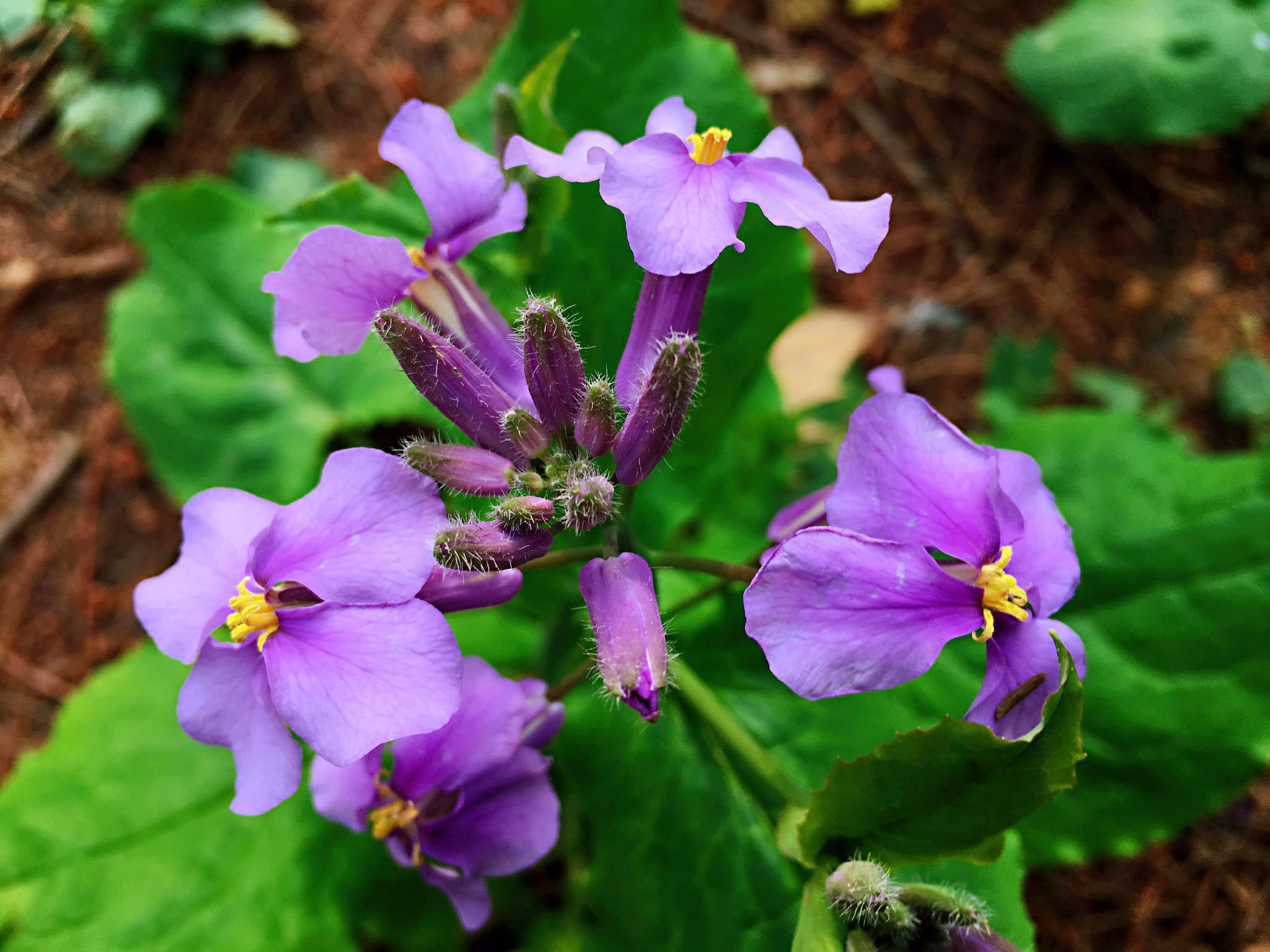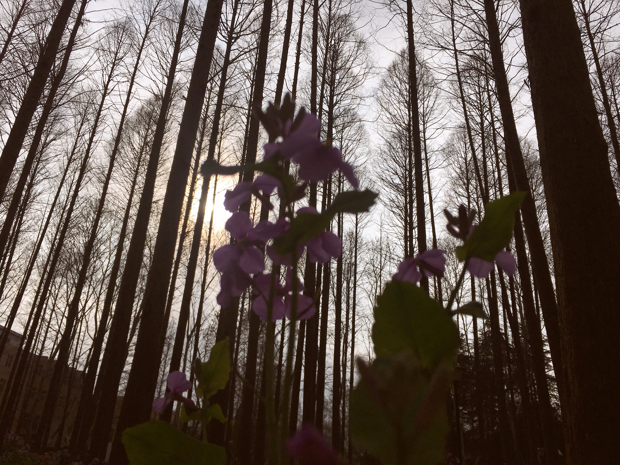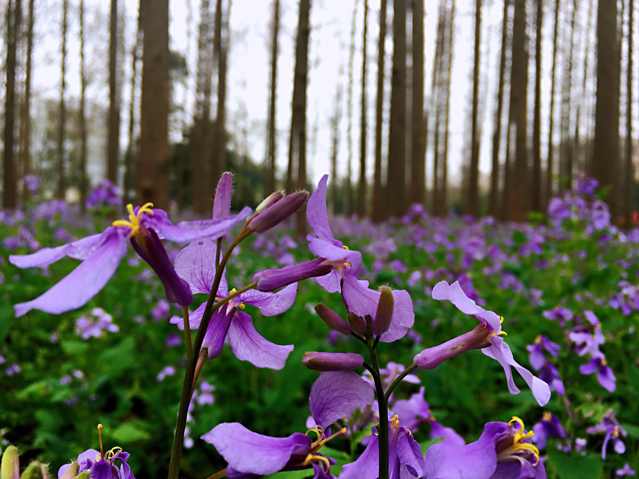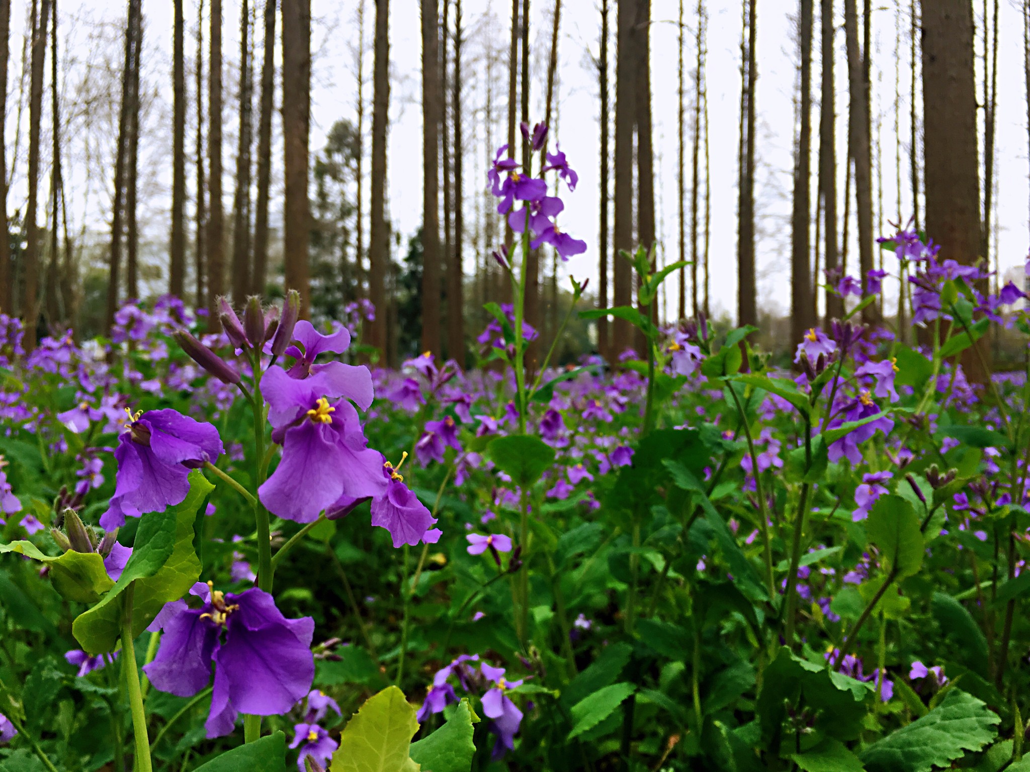理工大学因为二月兰的盛放而浪漫起来。沿着南理工大学的二号大门进入校园,淡淡的花香扑面而来。在成片的水杉林间,二月兰的那一抹紫色显得格外耀眼。清清淡淡的小花,繁密地铺陈在亭亭的水杉林里,若不是有一根根隔离践踏的红绳,几乎让人有跌入画境的不真实感。而这片水杉林,也正因为有了二月兰的簇拥。