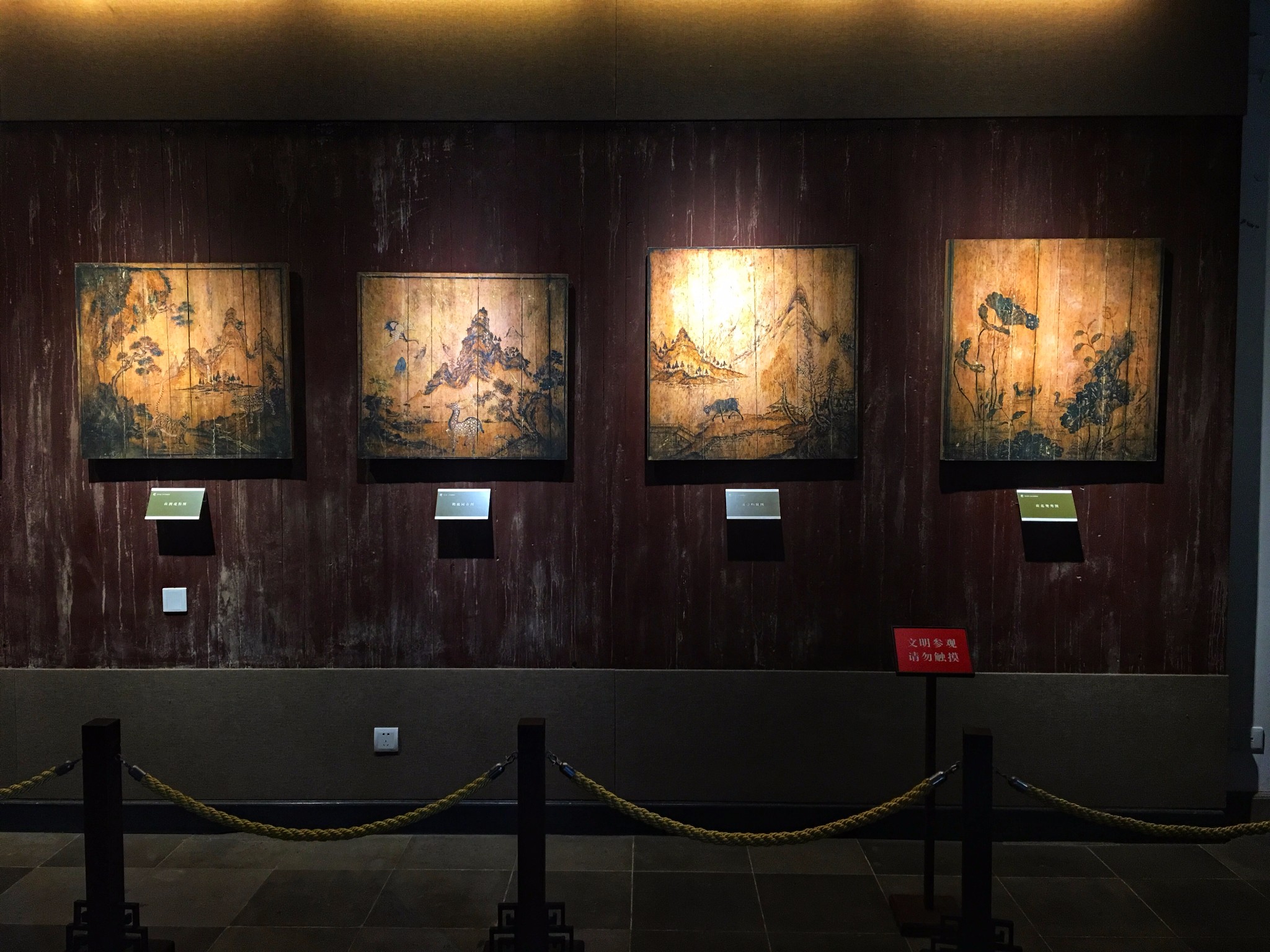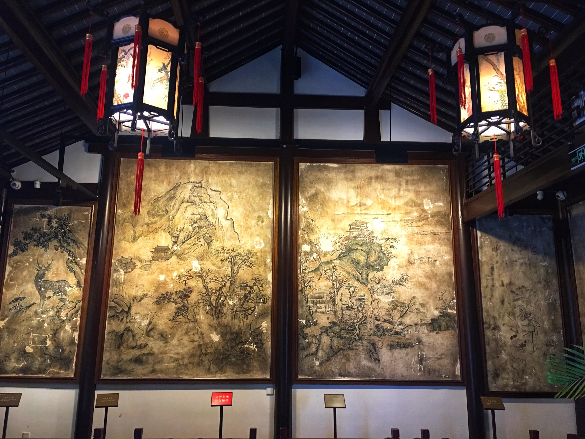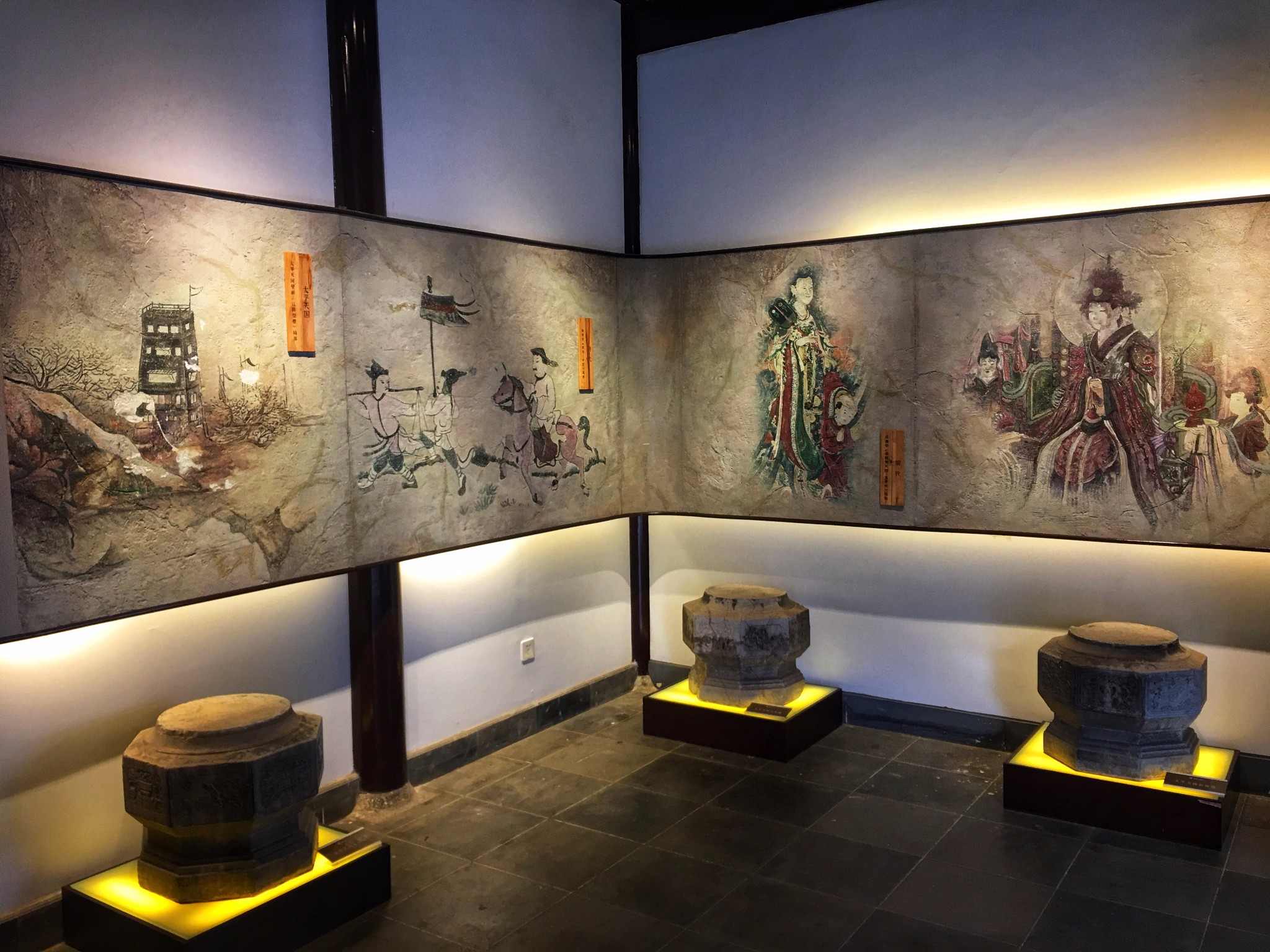 这里展出的都是太平天国时期遗存的壁画艺术,这里是 江南 一代太平天国壁画的展示中心,其中的珍品馆包含了 江南 多地发现的珍品壁画汇聚于此,主要展示的是太平天国时期政治,经济,军事,当然还有生活上的场景,有山有水有花鸟。其中最有名的是一厅的《防江望楼图》,描绘的是太平天国时期长江岸边军事设施,去的时候一定重点看看这幅,简直惟妙惟肖!如果说莫高窟是壁画艺术的经典,那么太平天国时期的壁画则可以称之为艺术高峰!