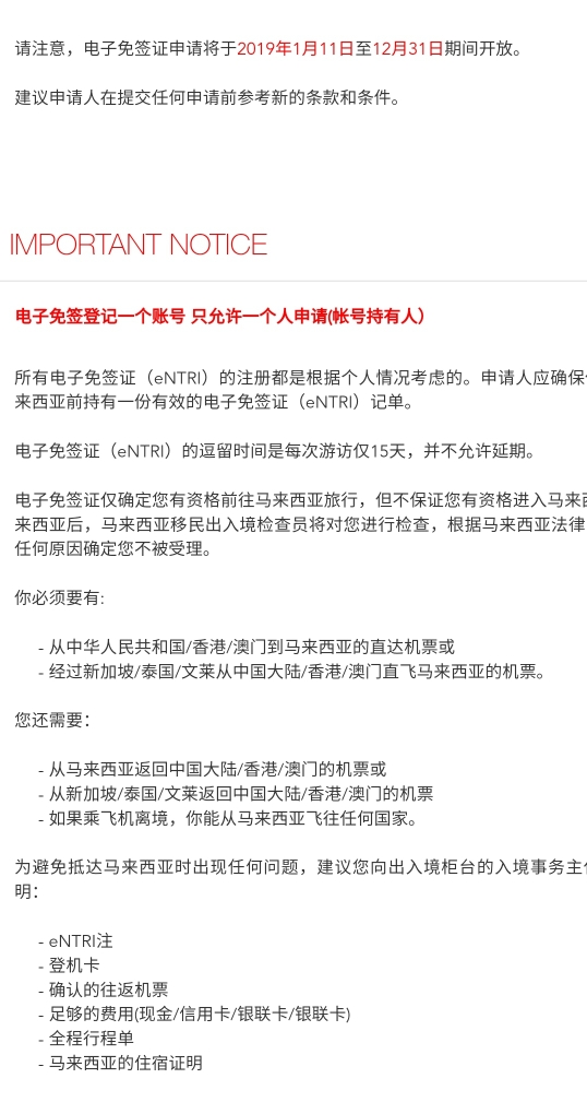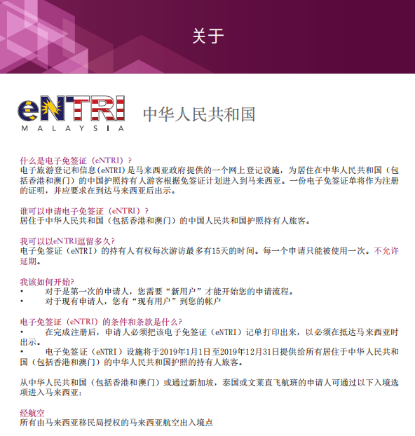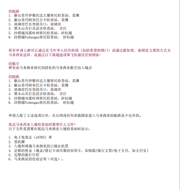 请把签证页用A4纸彩色打印后与护照一同使用(打印时请用下载的文件直接打印,不要用截图,不要更改尺寸)。请注意ENTRI签证:可从中国大陆地区(任意机场)直飞(或经泰国、新加坡、文莱转机)至马来西亚境内任意机场。返回的时候从马来西亚境内任意机场直飞(或经泰国、新加坡、文莱转机)返回中国大陆地区(...显示全部