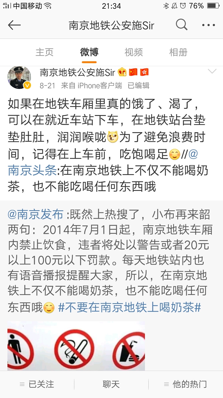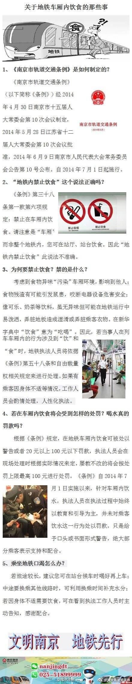 我觉得在地铁上最好不吃东西,不管是南京的地铁还是北京的地铁。首先说地铁空间有限,乘客又多,吃东西会发出各种味道,会影响到其他乘客;二是吃东西有可能会造成对地铁车厢环境的污染,喝奶茶这类的东西,在人多拥挤的情况下还有可能弄脏别人的衣服。所以制定惩罚措施也是逼不得已的。该罚就要罚!========...显示全部