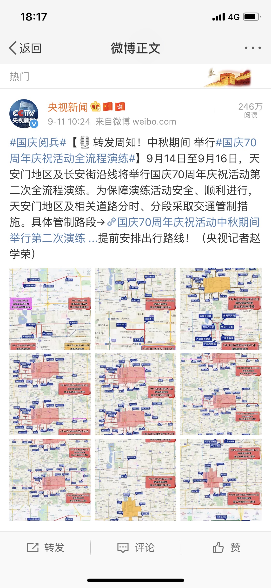 [题主采纳]您好,上面几个图是目前网上可以查到的通告下面这个是第二次演练的限行通知:(尤其注意限行的时间段)北京市公安局通告的全文*** 根据目前国博和故宫官网贴出的通知,9月21日到10月2日之间,都不排除天安门及天安门广场周边有全天或分时段限行限流的情况,所以建议您这个时间段不要前往该区域...显示全部
