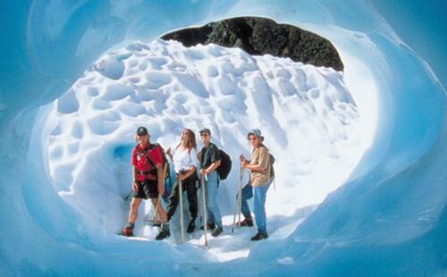 和约瑟福冰川,两者都属于世界罕见的海洋冰川,冰川尾部一度直接入海。这两个冰川都更为陡峭,蓝洞等景观更为丰富。从机场起飞后迅速可以到达,沿途从雨林景观一路变化到冰川地貌。附近还有跳伞,马瑟森湖等景观。这两个冰川也都有半日和全日。