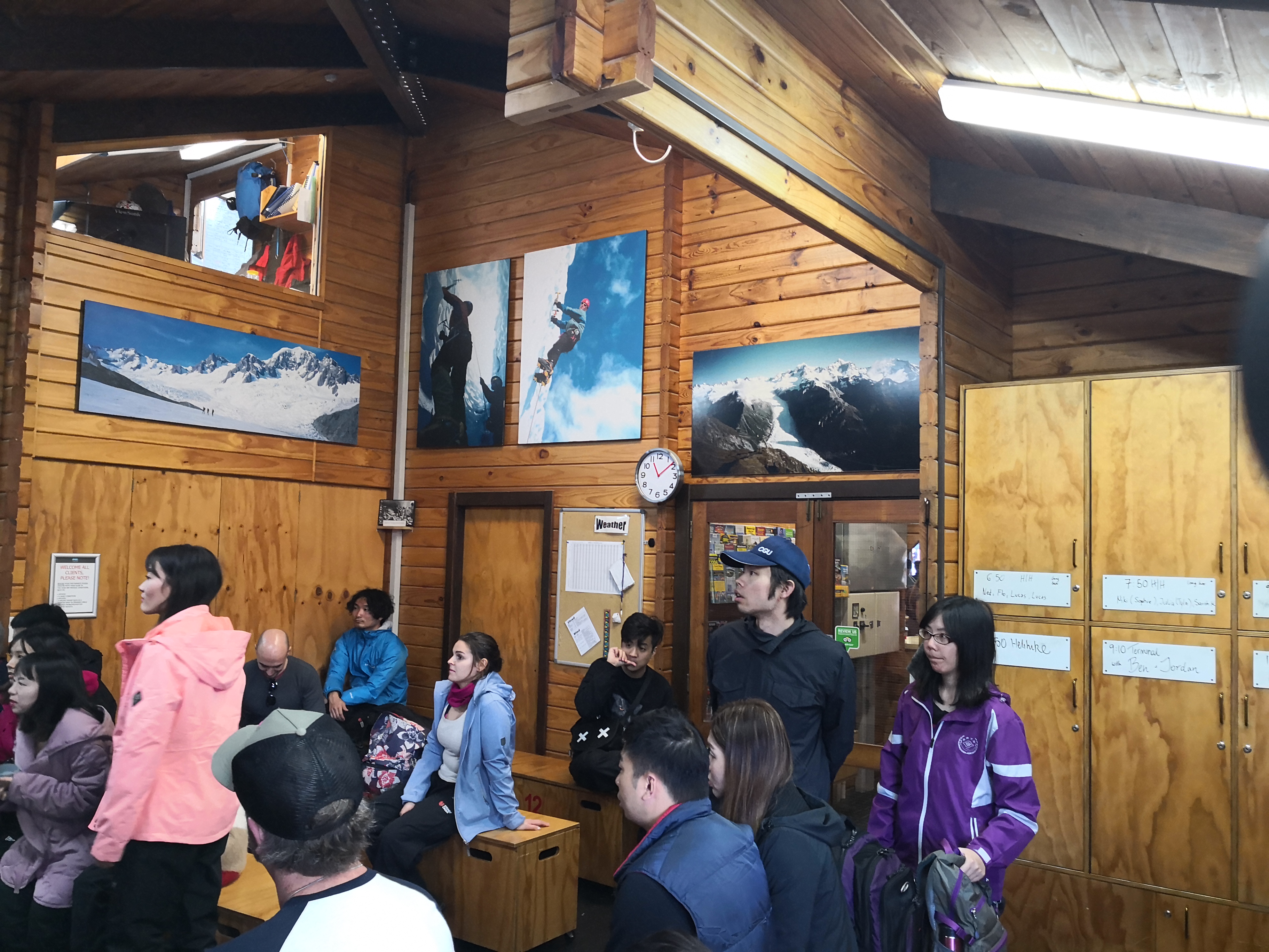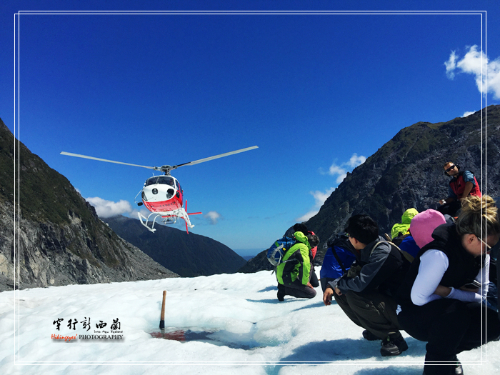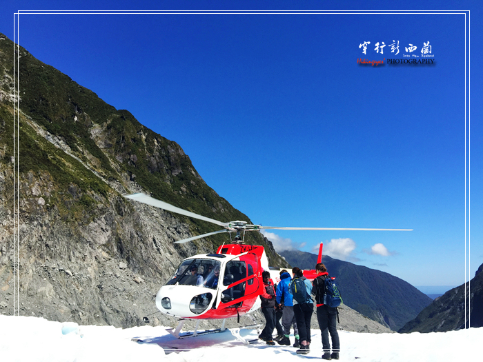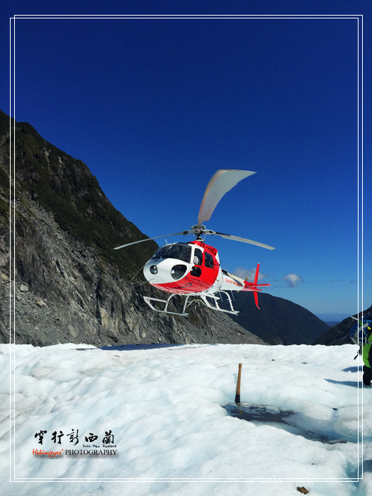 到了停机坪,先由工作人员将我们分组,因为一次飞机只能加机师载六人,分组的大致原则是按重量分配,大致坐前排的都是轻的,后排的安排重的。然后开始讲解安全须知和换登山装备,登上冰川需要换上特制有冰爪的靴子,如果御寒的服装不够也可以在这租用的。整个介绍过程不用担心听不懂,因为每个安全须知都有中文演示,看来 中国 人来旅游的不是一般的多呀。