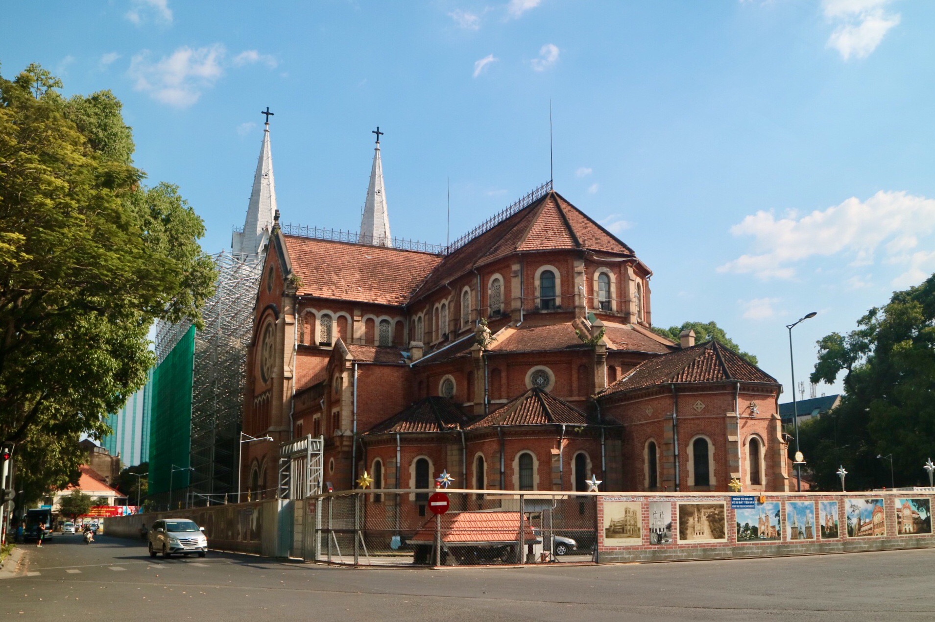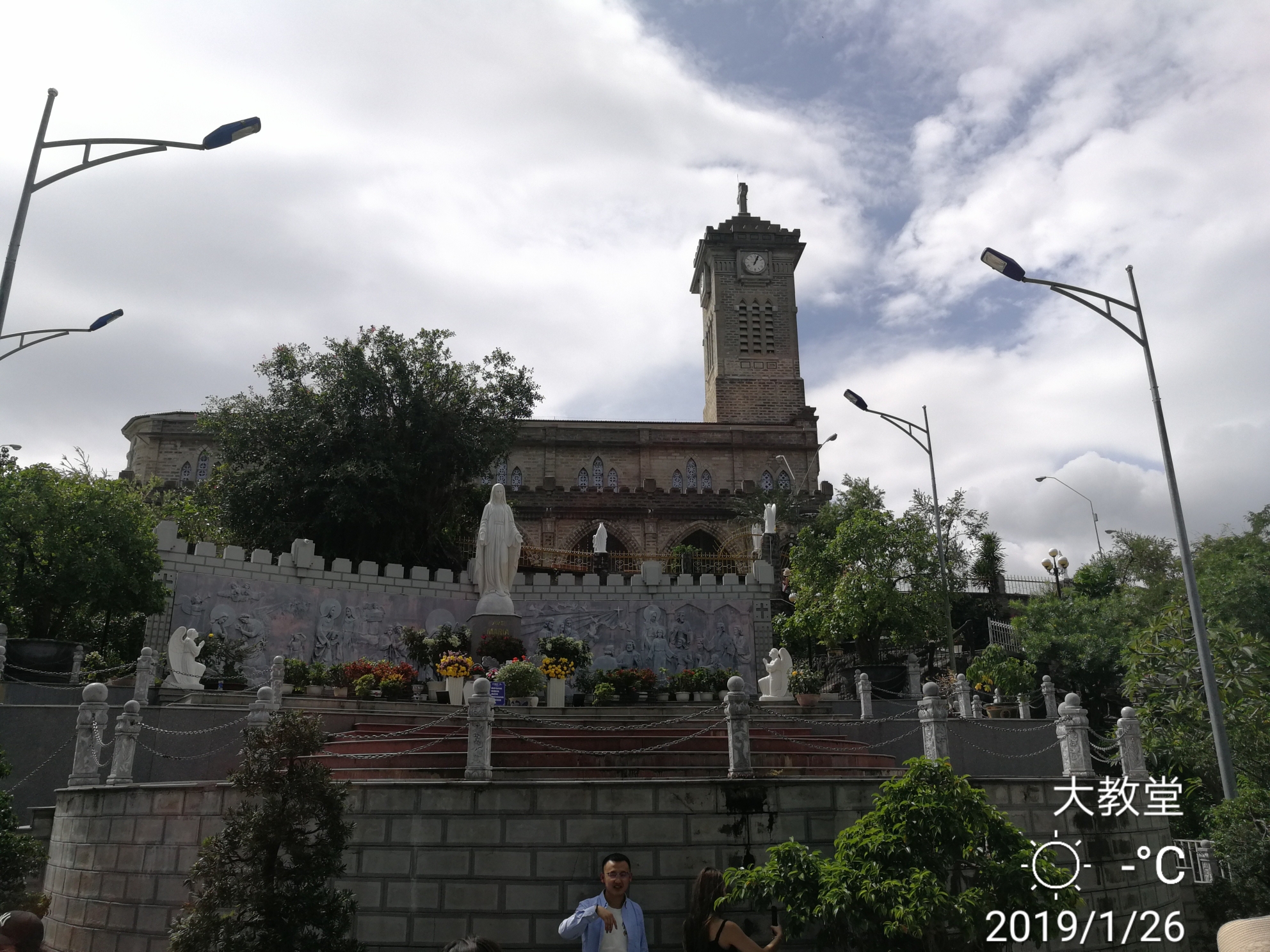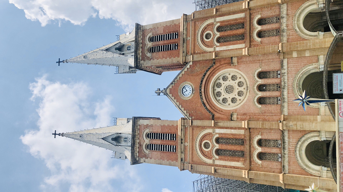 的标志建筑,比想象中高大,很有仪式感,据说当年建造教堂的红砖都是从法国运来的。遗憾的是,我们正好赶上教堂外墙维修,没有看到传说中的心形砖墙和彩绘玻璃,每张照片都会拍到脚手架。