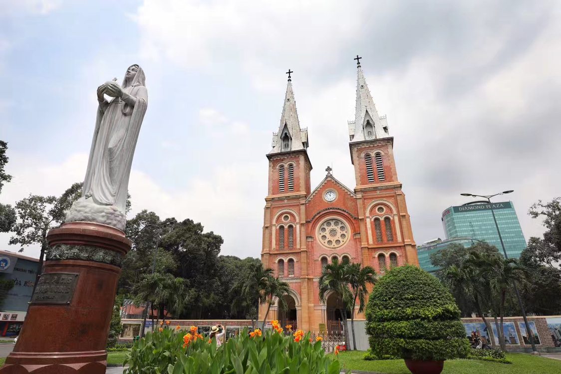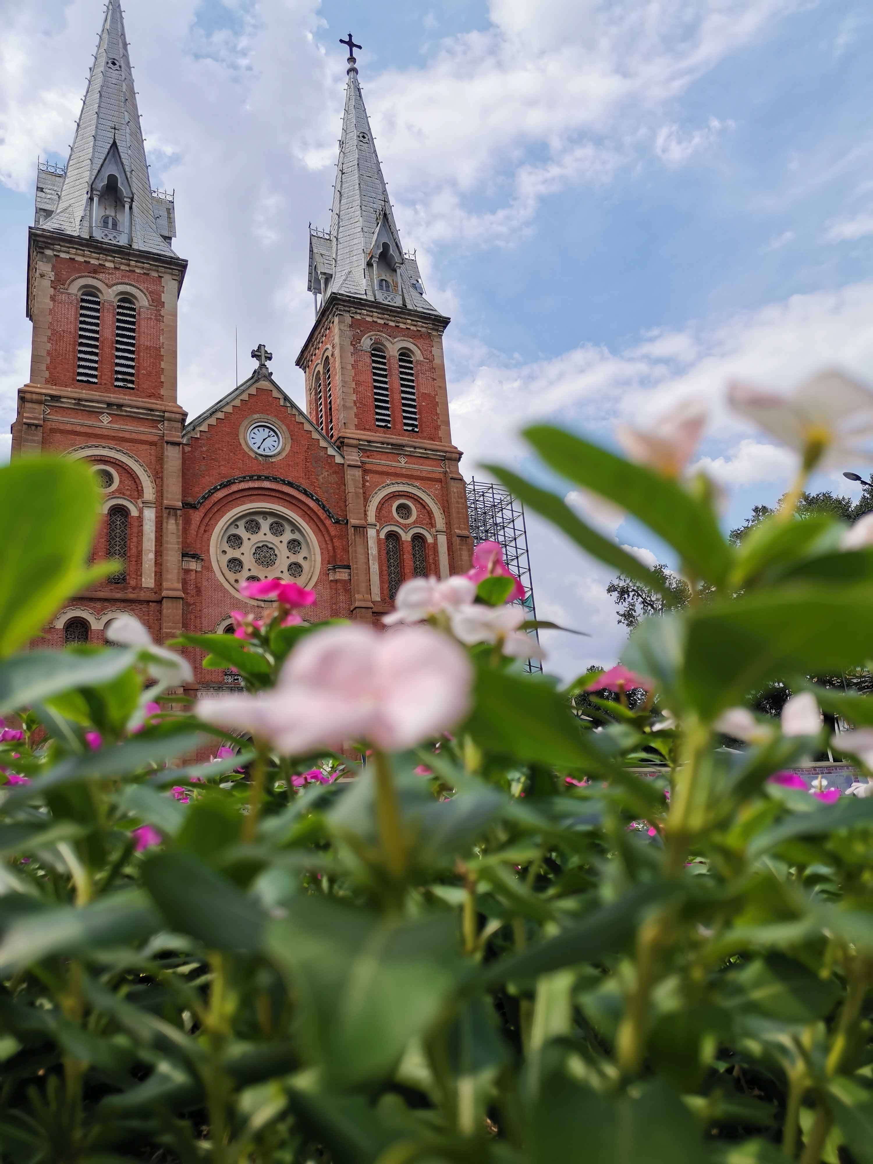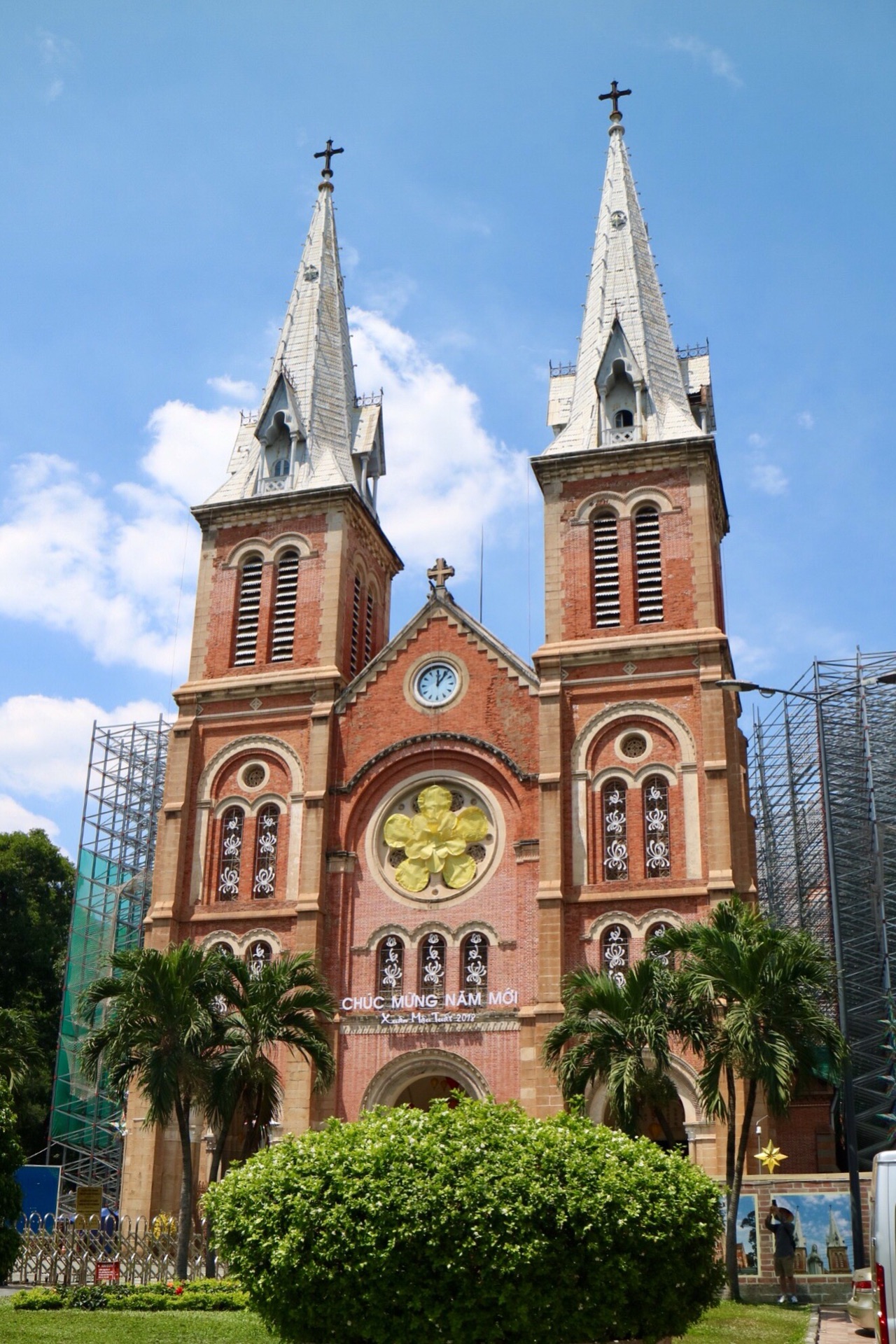 的标志建筑,比想象中高大,很有仪式感,据说当年建造教堂的红砖都是从法国运来的。遗憾的是,我们正好赶上教堂外墙维修,没有看到传说中的心形砖墙和彩绘玻璃,每张照片都会拍到脚手架。