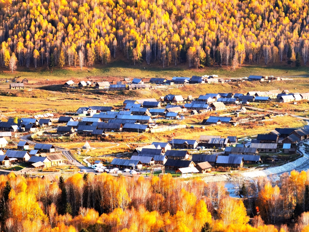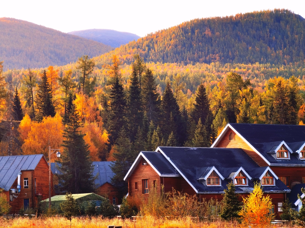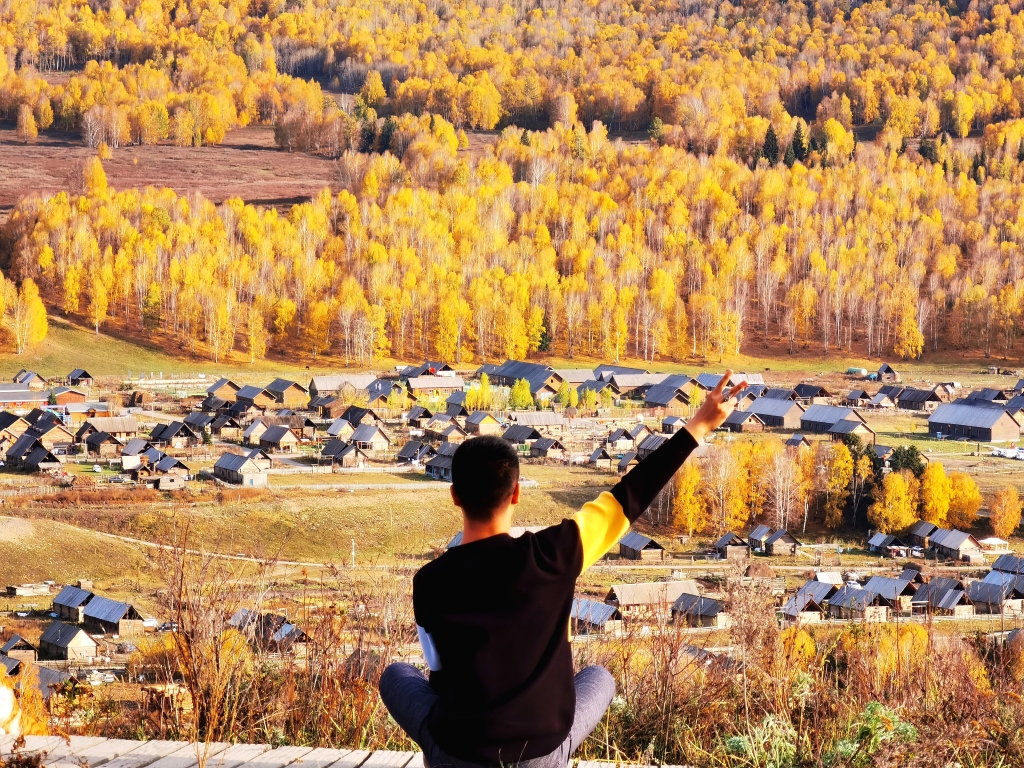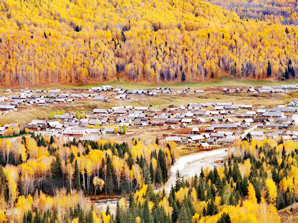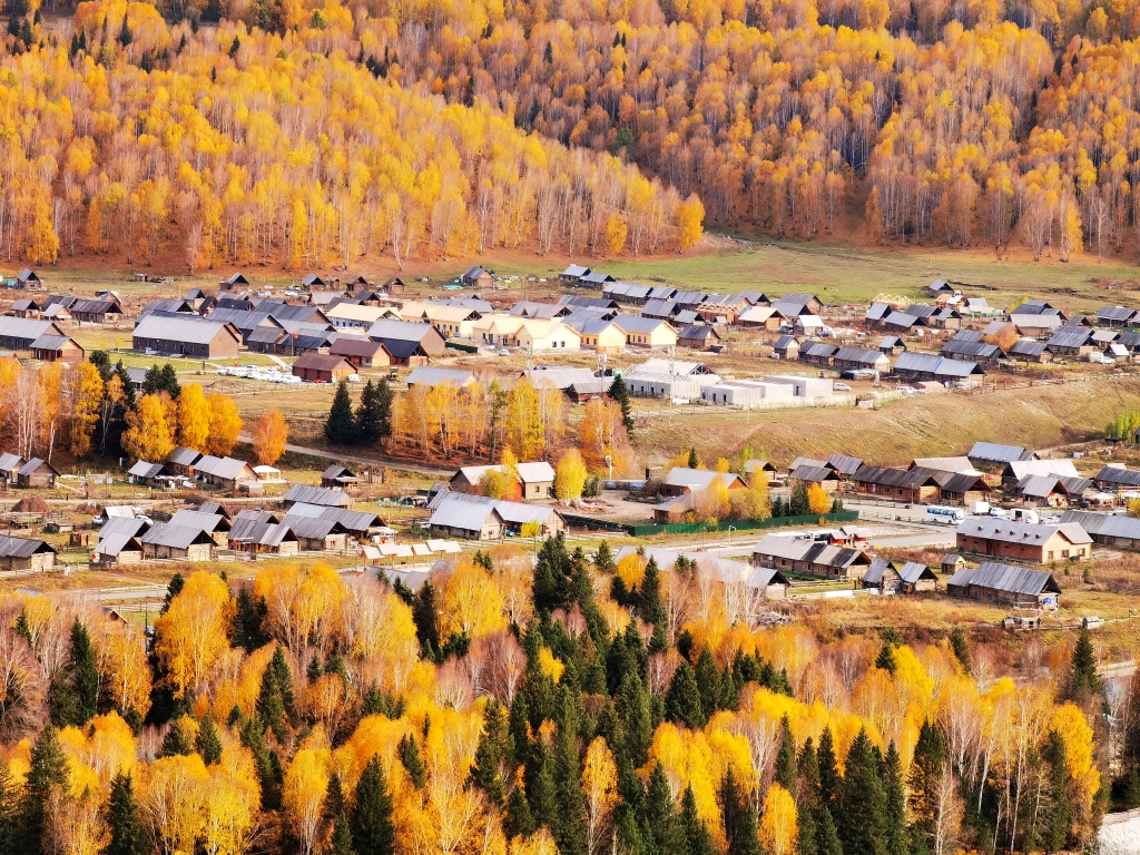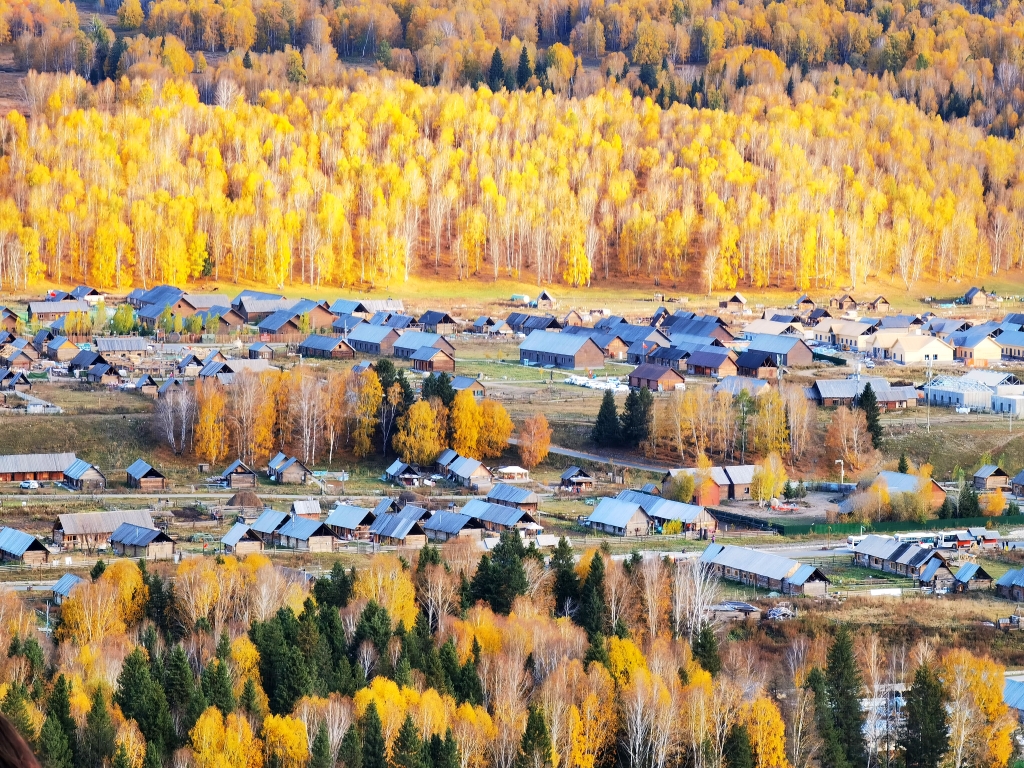 原木垒起的小木屋,炊烟袅袅,漫步白桦云杉,感受禾木村的一地金黄。