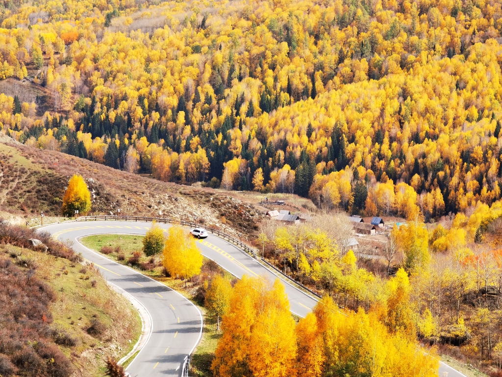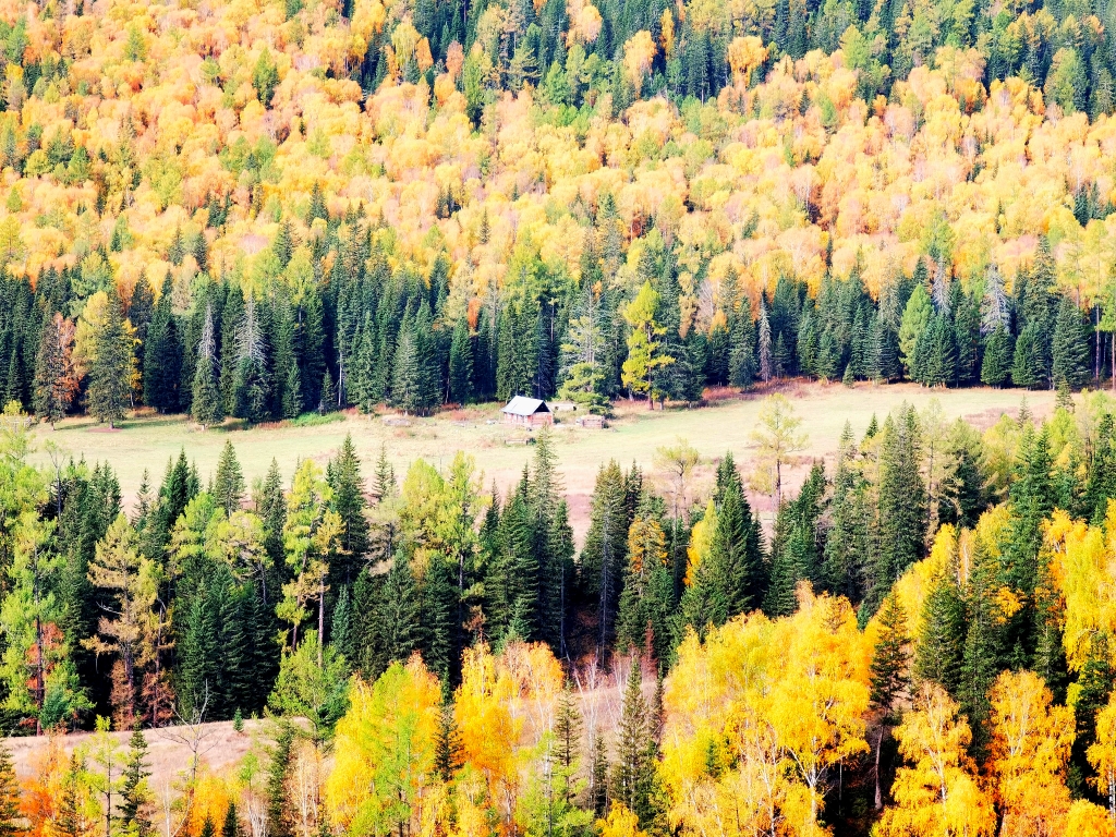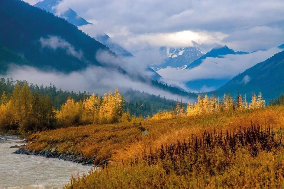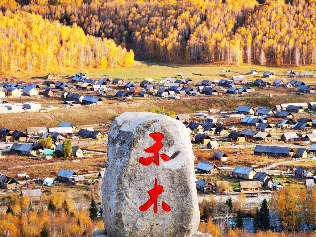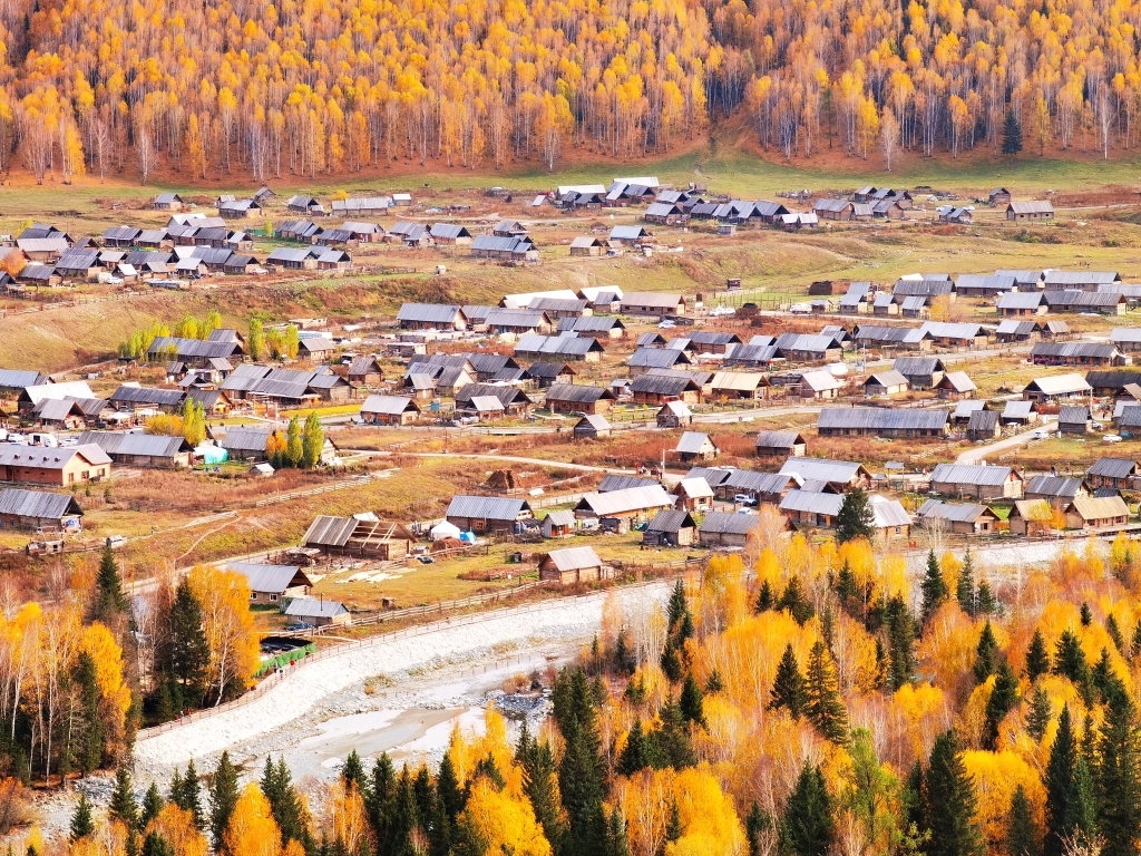 原木垒起的小木屋,炊烟袅袅,漫步白桦云杉,感受禾木村的一地金黄。