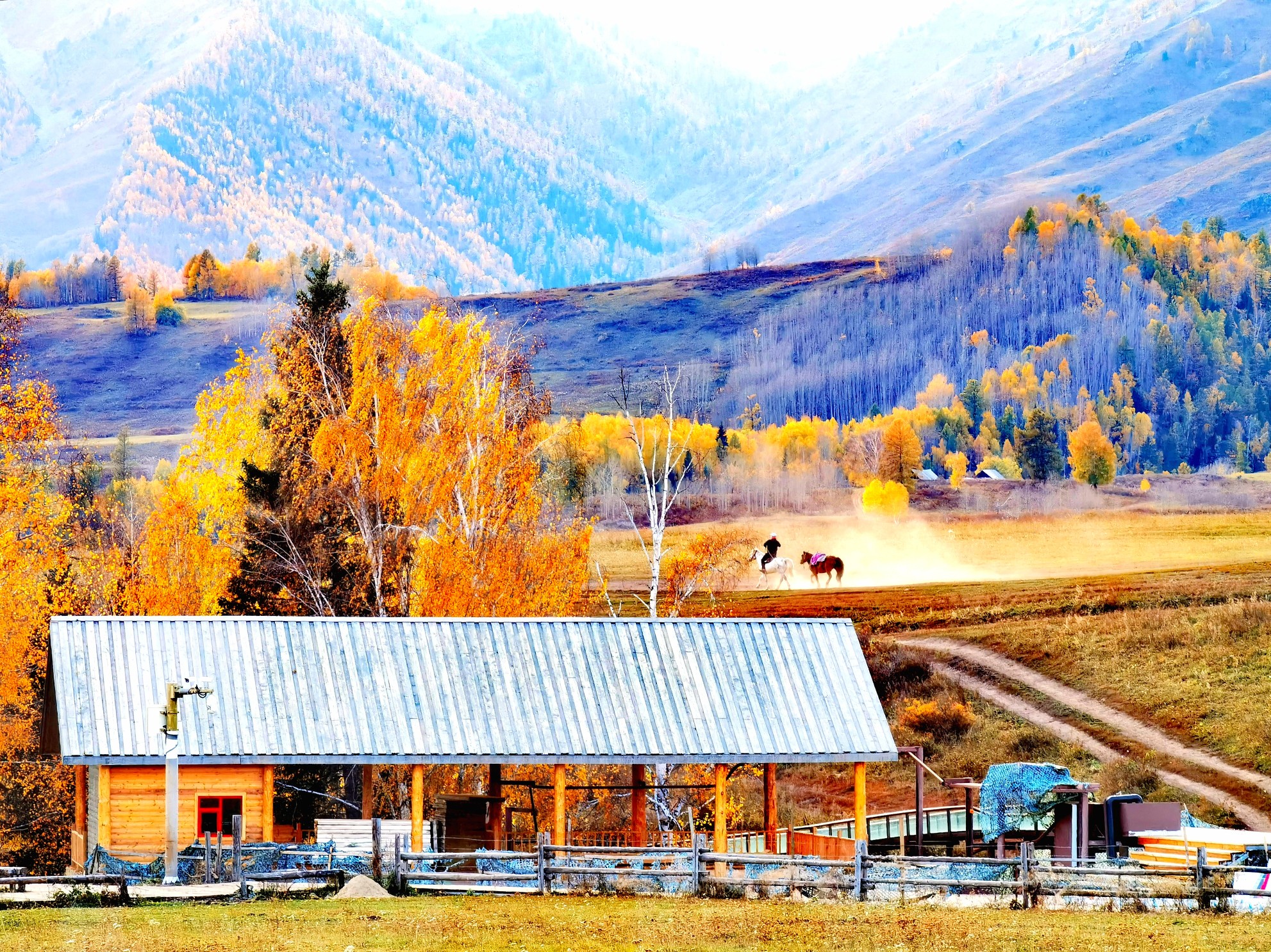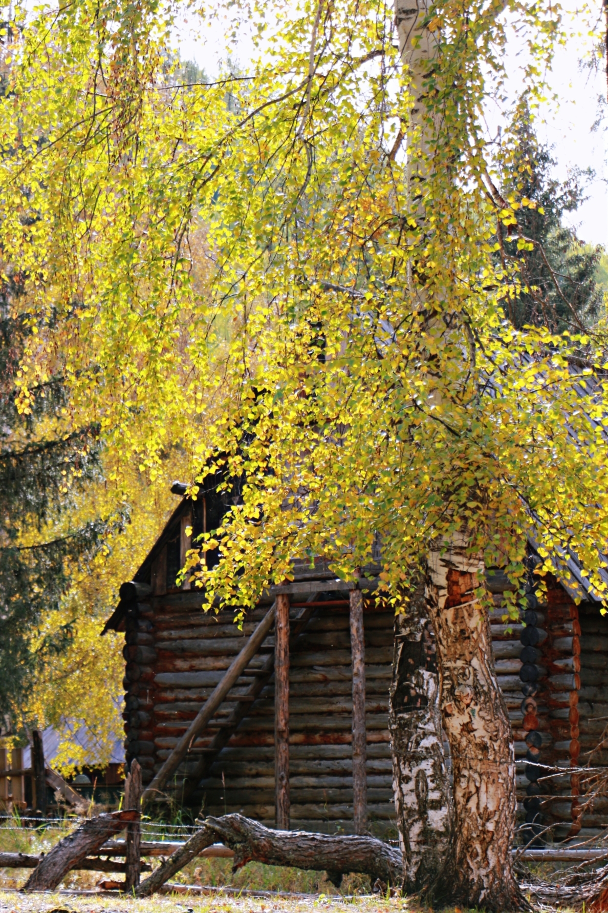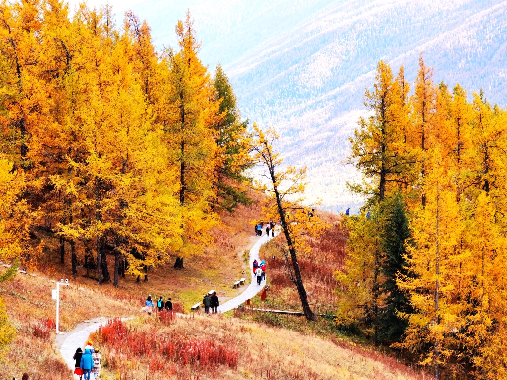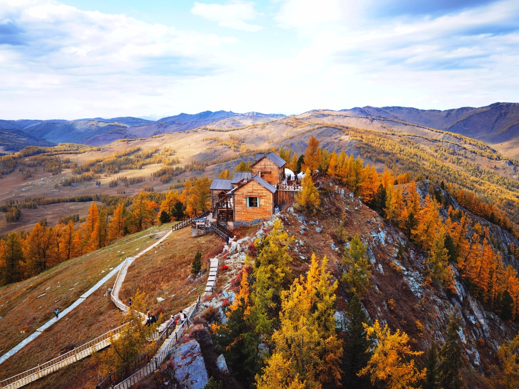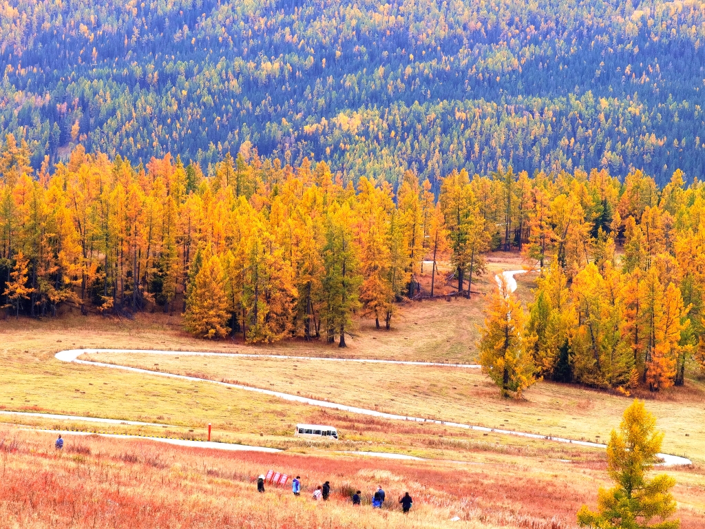 原木垒起的小木屋,炊烟袅袅,漫步白桦云杉,感受禾木村的一地金黄。