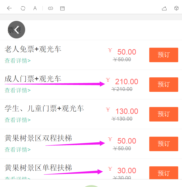 看下图,来自购票官微——快行漫游网(需要提前一天以上按时段预约门票),门票+观光车是必买的,现在的价格没有优惠,是210一个人,大瀑布景区里面有个大扶梯,单程30,往返50,这个可以不买,步行的话大概15-20分钟的路,天星桥最后面有个缆车,完全可以不坐,走十来分钟就出来了,其它的就是你的餐费...显示全部