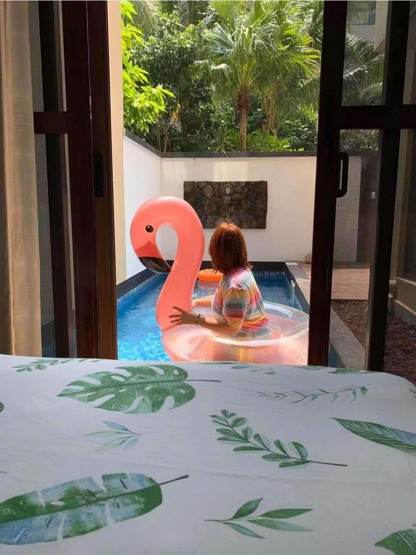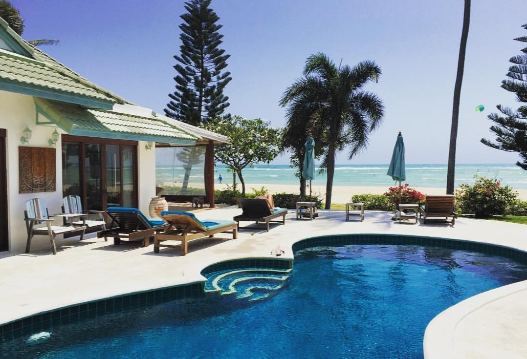 比如说这样的海滨别墅,外面有泳池和能直接下海浮潜的大沙滩,价格约3000多~5000人民币,但是可住六人~八人,一个人才多少钱吖?这个你算算。