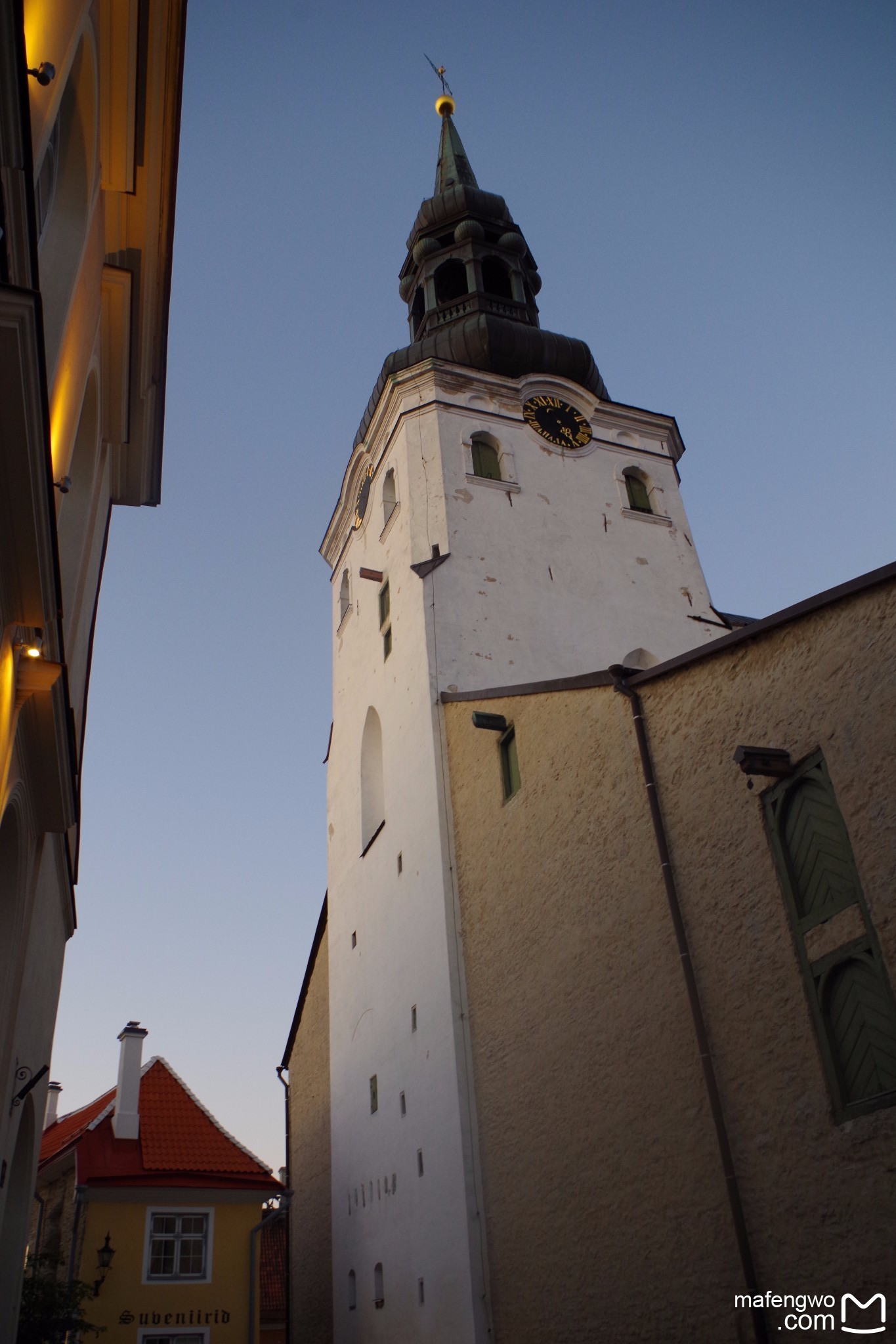 圣奥拉夫教堂的铜绿色的尖塔被灯光点亮