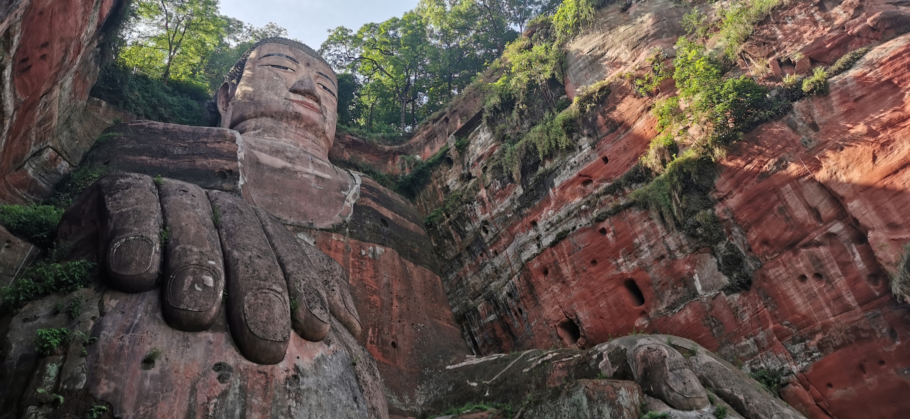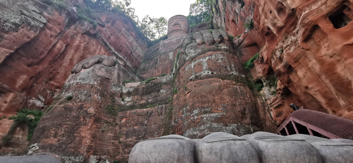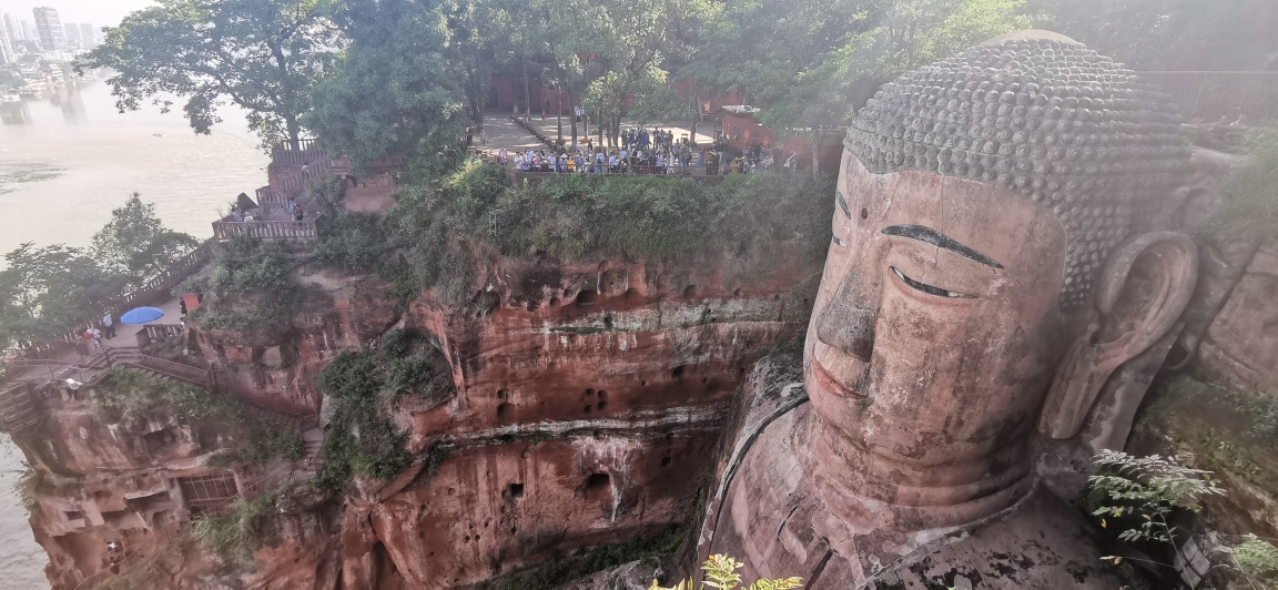 大佛的头部部位,如果体力好的话可以走栈道绕道大佛的脚部,栈道是单行道,从大佛的这一侧下山,另一侧上山。(这里的山是指大佛依山而建的那座山。下山就是从头部位置下到脚部的位置,从山下上来就又回到头部位置了,栈道较窄而且陡峭,需要注意安全不能拥挤,为了安全尽量不要停留拍照)