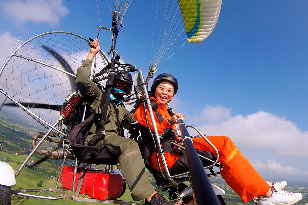 体验感满分飞上1000米高空,近距离感受蓝天白云和阳光,俯瞰山间绿田风光。
