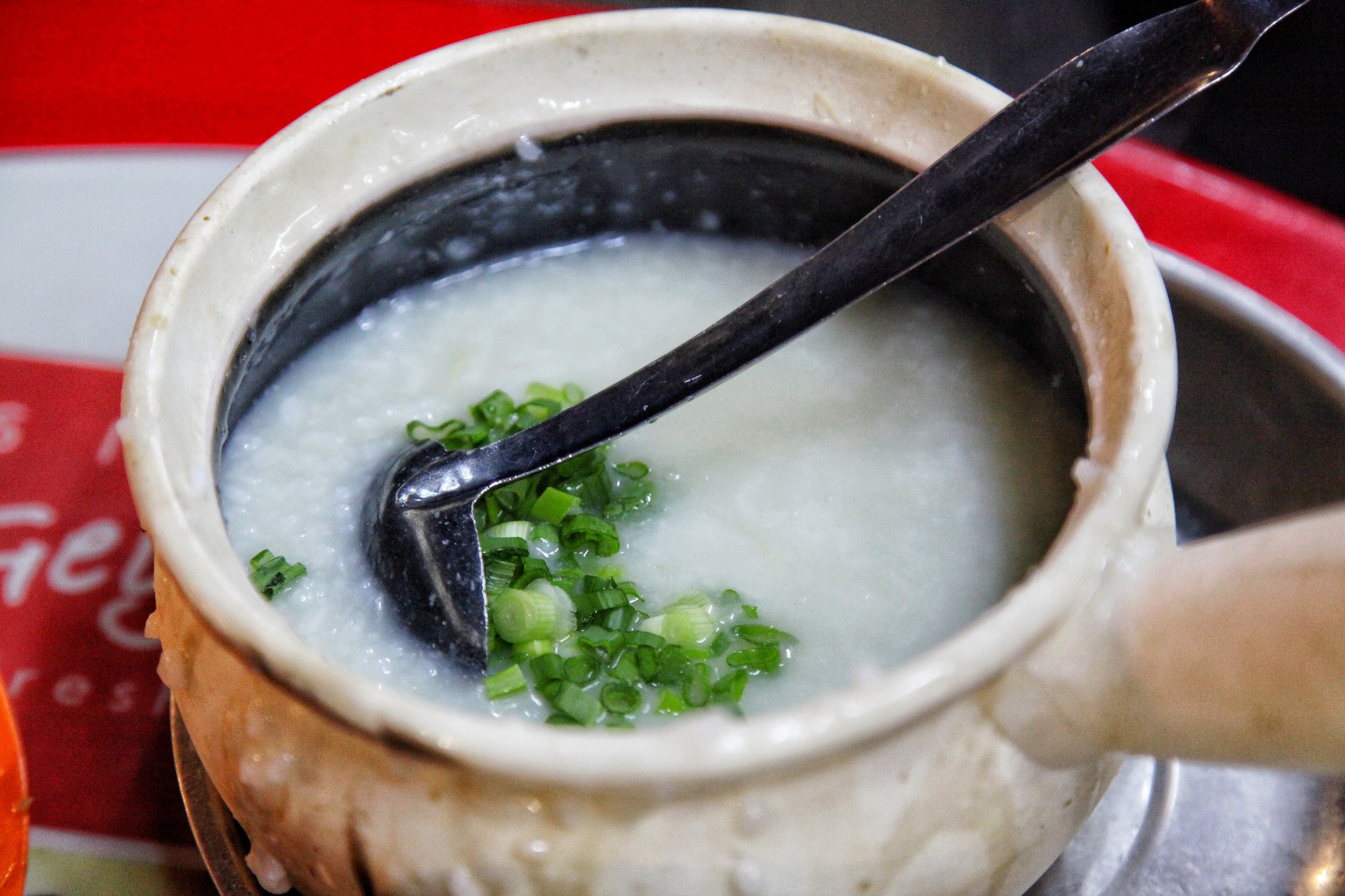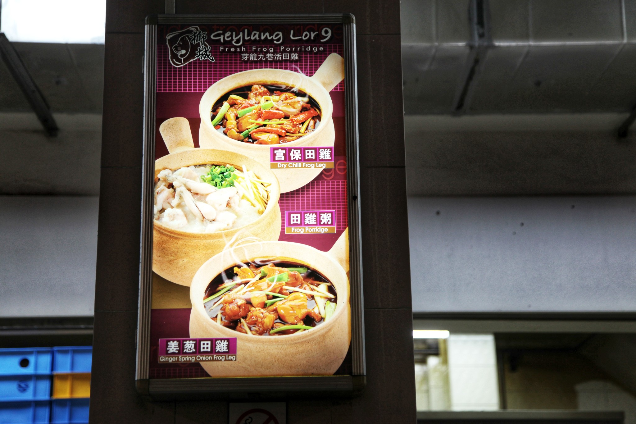 九巷活田鸡田鸡有辣和不辣,辣的放了泰椒,不辣的放香葱,我们点了大的辣的宫保田鸡,23新币,配上两人份量的粥水3新币。