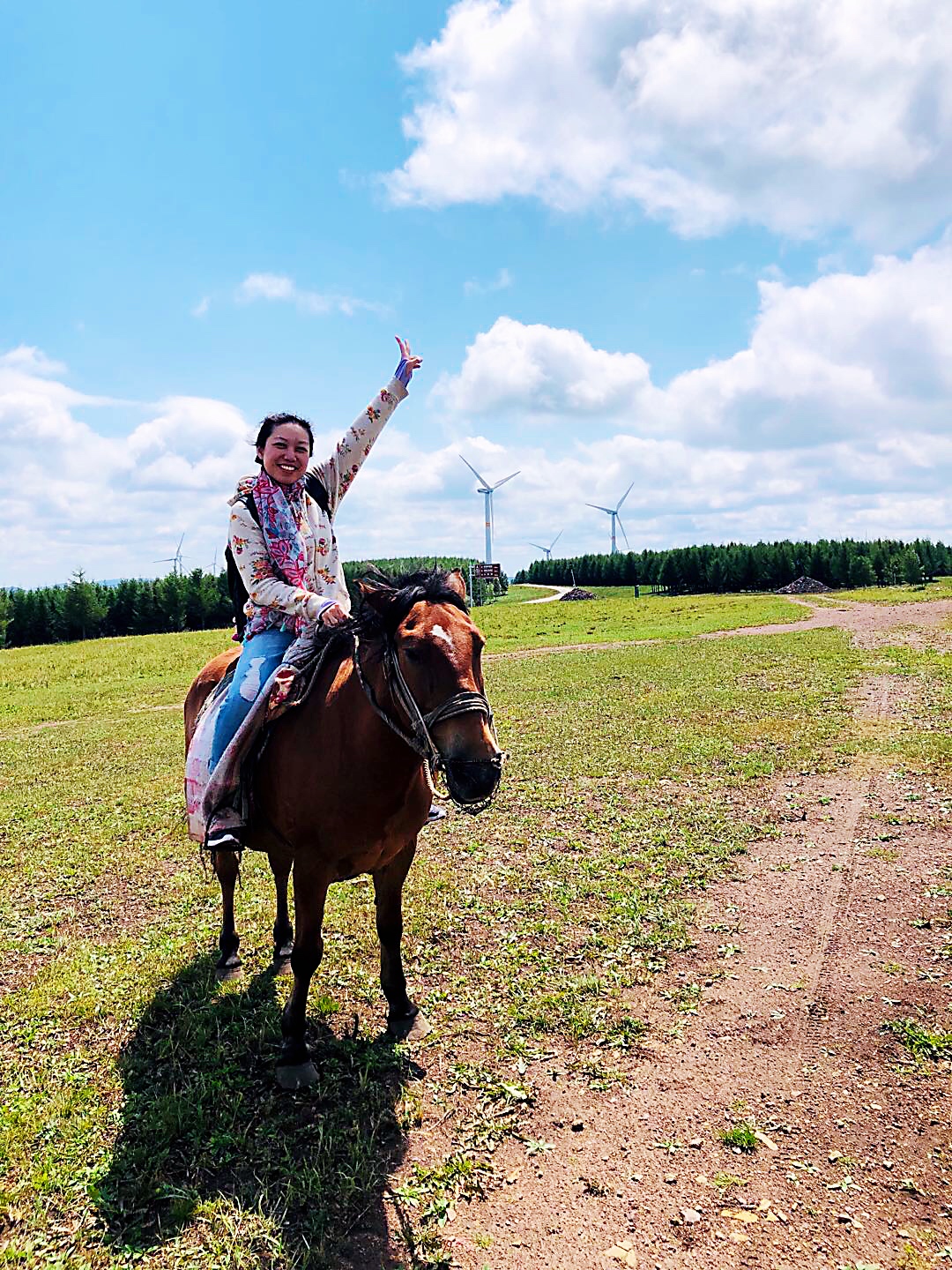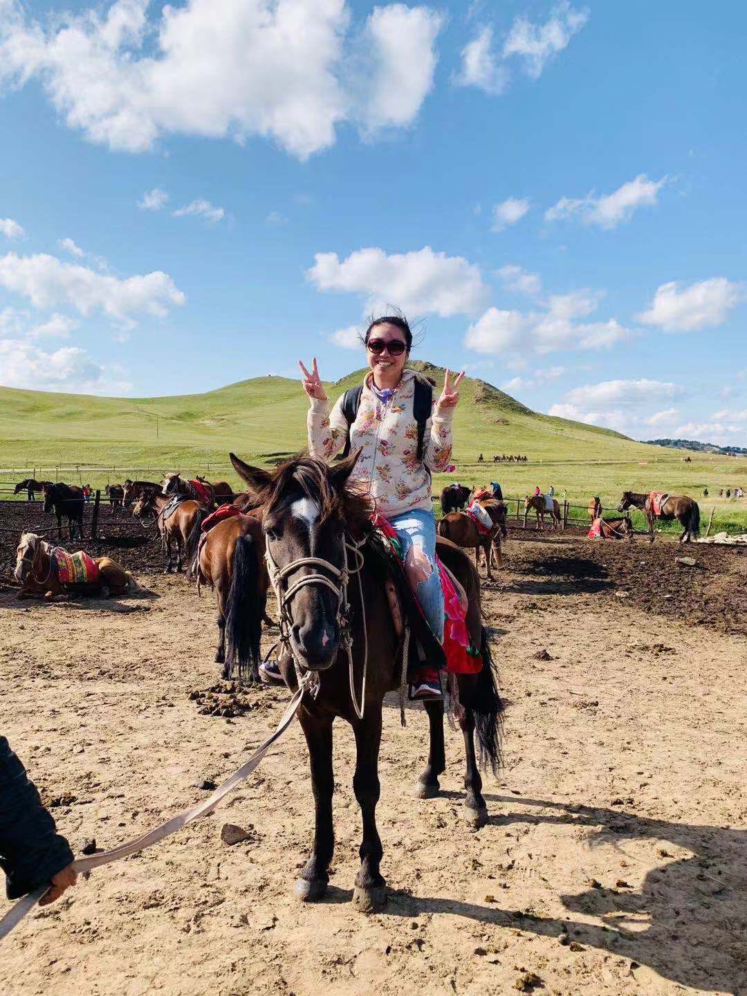 超级兴奋·激动·跃跃欲试;还不忘时刻叮嘱牵马的大叔:"您一定要牢牢帮我抓紧缰绳,保证我的安全呀。" 然后,在牵马大叔的帮助下,战战兢兢地成功坐到了马背上,立刻开始了各种迫不及待地自拍+摆拍。哈哈哈