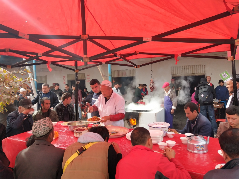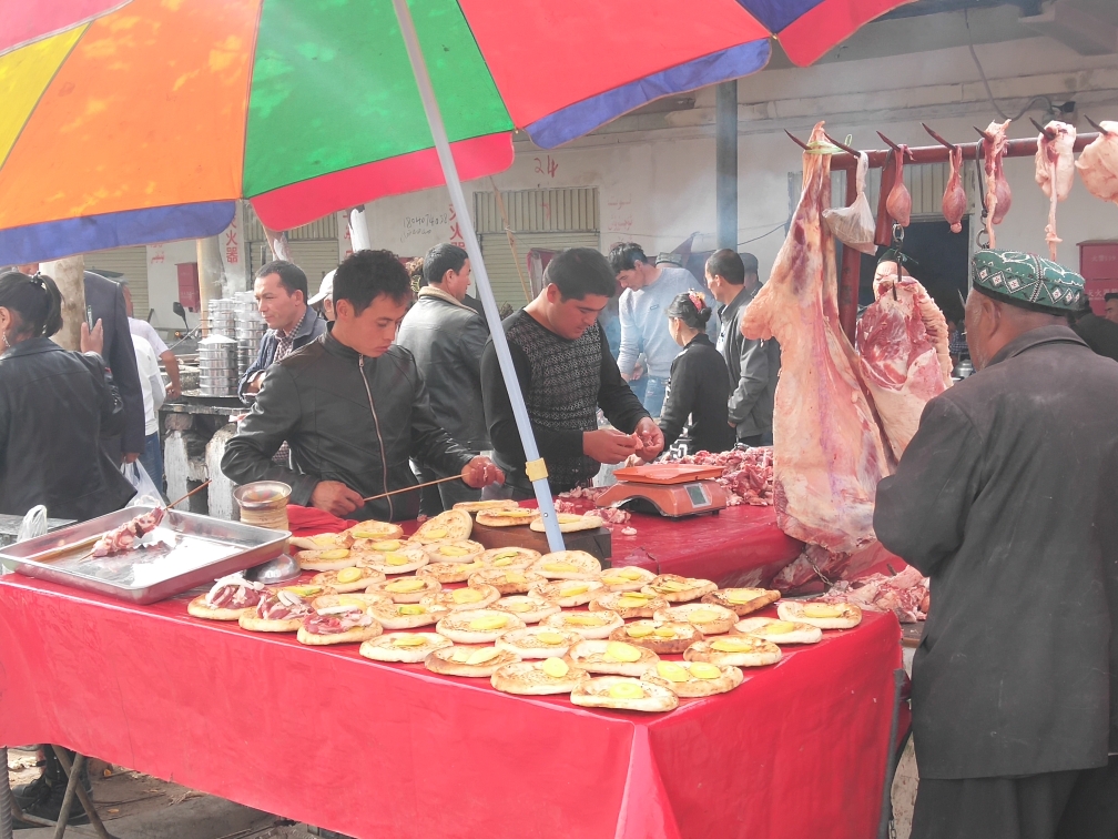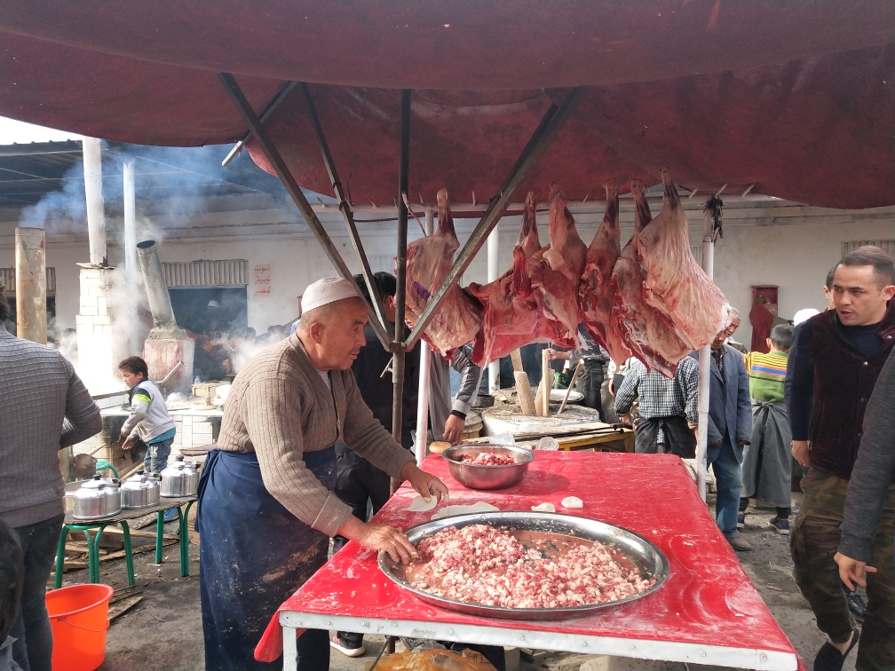 每周日荒地乡的牛羊大巴扎,也是美食的盛会,馕烤肉,抓饭,拌面,烤包子,缸子肉都有。