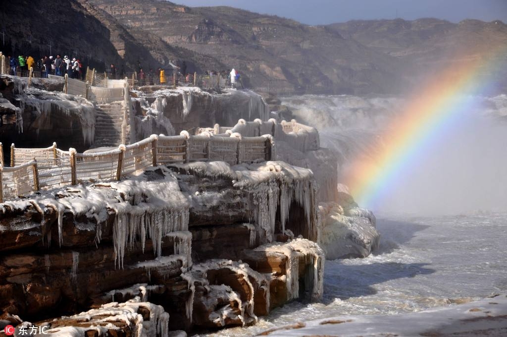 每年冬季,由于西伯利亚冷空气南下,气温骤降,位于秦晋峡谷段黄河壶口瀑布下游出现冰凌封堵景观,200多米宽的黄河峡谷被冰凌全部覆盖。由于大量的冰凌堆积,壶口瀑布已被冰凌覆盖,往日的飞瀑停滞,水流落差不见踪影。人们能感受到不寻常的瀑布和宏大的冰川奇观