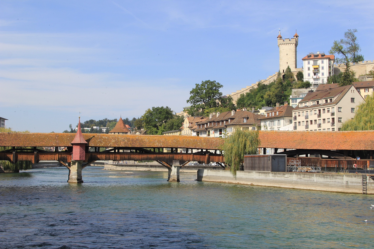 的访问是不完整的。覆盖的人行桥跨过罗伊斯河(Reuss River)对角线。据说它是欧洲最古老的木桥,始建于1333年以保护城市。穿越时抬头;内部覆盖着描绘
