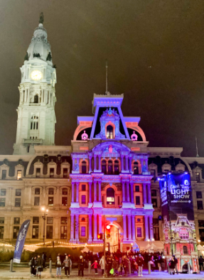 市政厅正面,会有投影的雪花,整点(应该是整点的时候)会有音乐秀一样的,投影在主楼前,配有音乐,非常赞。可惜当时匆忙路过,没来得及录下来