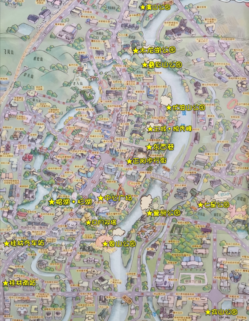 王府独秀峰旁边有很多,有时间的话你绕湖一圈就可以全部经过了。具体如下:芦笛岩去了吗?我觉得是桂林最惊艳的景点了,国宾洞不是浪得虚名的。桂林山水甲天下,没想到溶洞也甲天下。交通也很方便,坐公交车半个小时就到了。象鼻山是城市象征了,现在还有一个大型的灯光秀——象山传奇,晚上利用灯光投影的,据说不错...显示全部