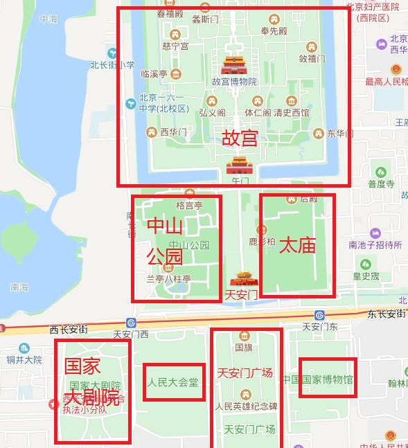 长安街沿线东单到西单。中间包括的东单大街,西单大街、王府井大街这三条大街吃的逛的都很全。主要说一下长安街的天安门广场。从南边开始是:天坛公园- 是明、清两代皇帝“祭天”“祈谷”的场所,位于正阳门外东侧。坛域北呈圆形,南为方形,寓意“天圆地方”。四周环筑坛墙两道,把全坛分为内坛、外坛两部分,总面...显示全部