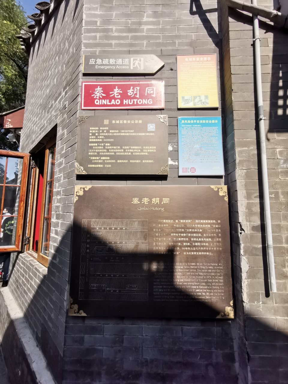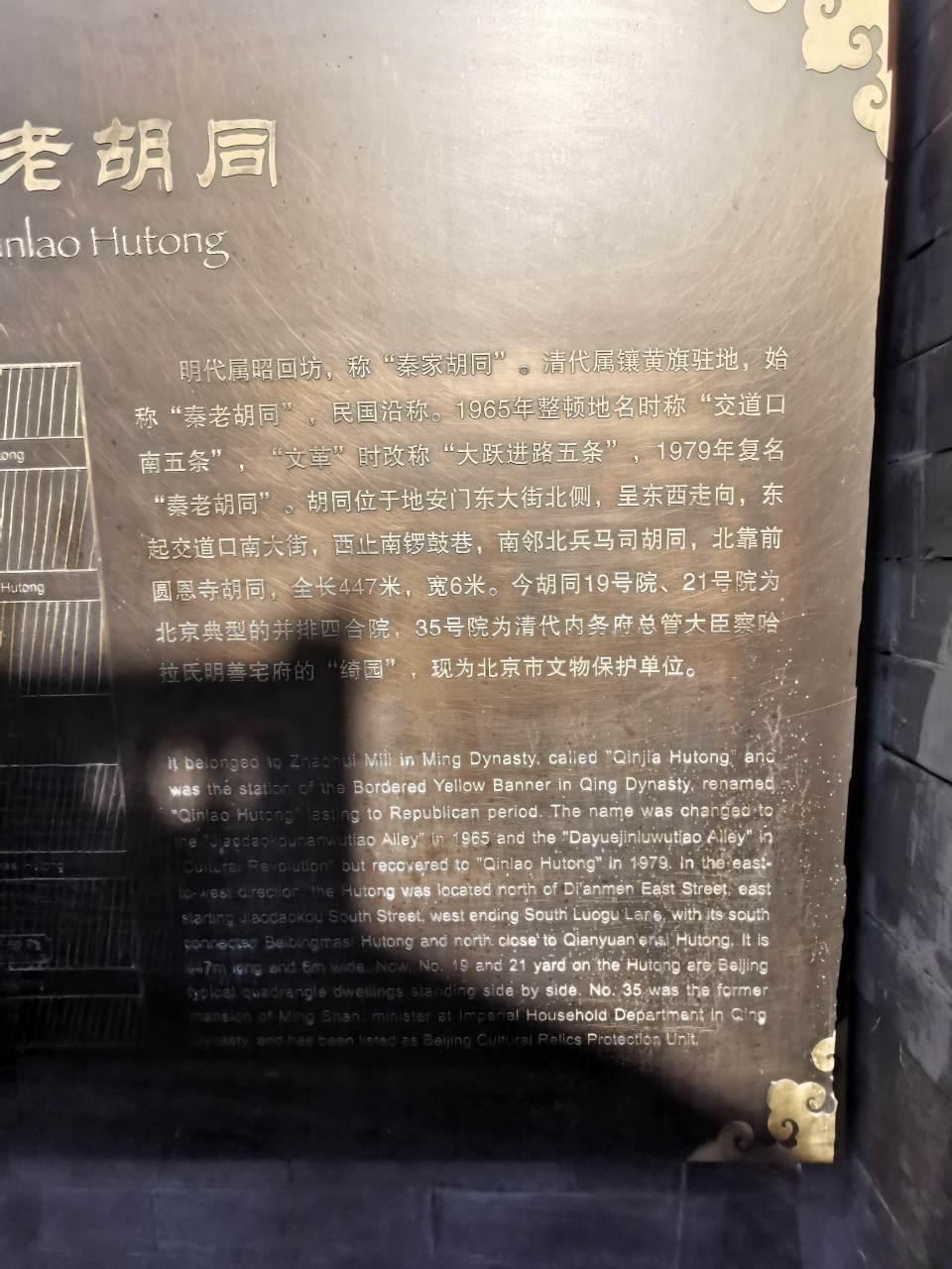附近是秦老胡同,明代属昭回坊,清代是镶黄旗驻地,这条胡同也有一处名人故居,35号院为清代内务府总管大臣,明善的故居。现为