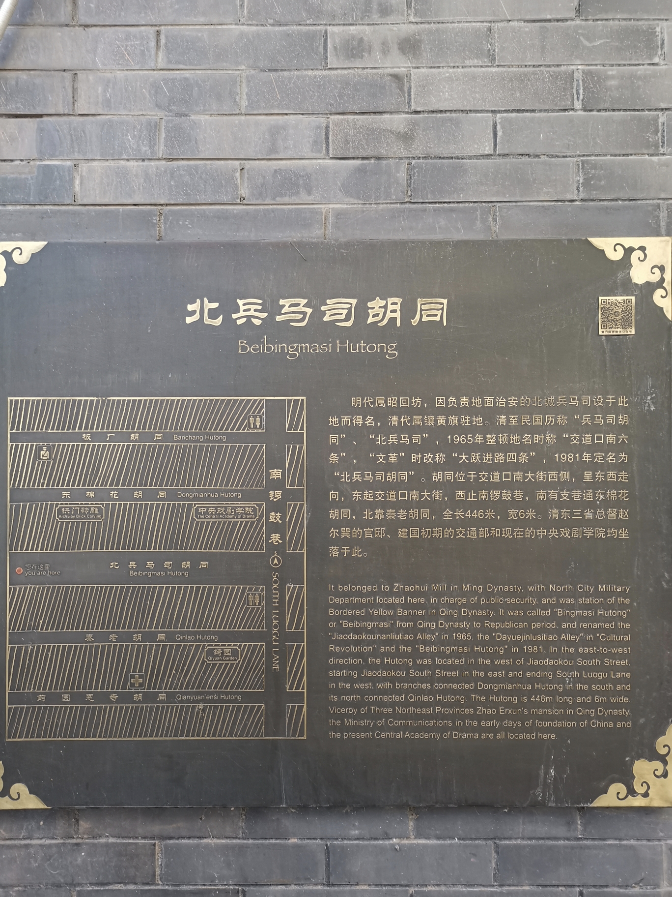 北兵马司胡同,明代属昭回坊,因此地为住北城的兵马司所在地,故叫做北兵马司胡同。清代属镶黄旗驻地,胡同内有清代东三省总督的旧居,现在,中央戏剧学院在胡同的西部。