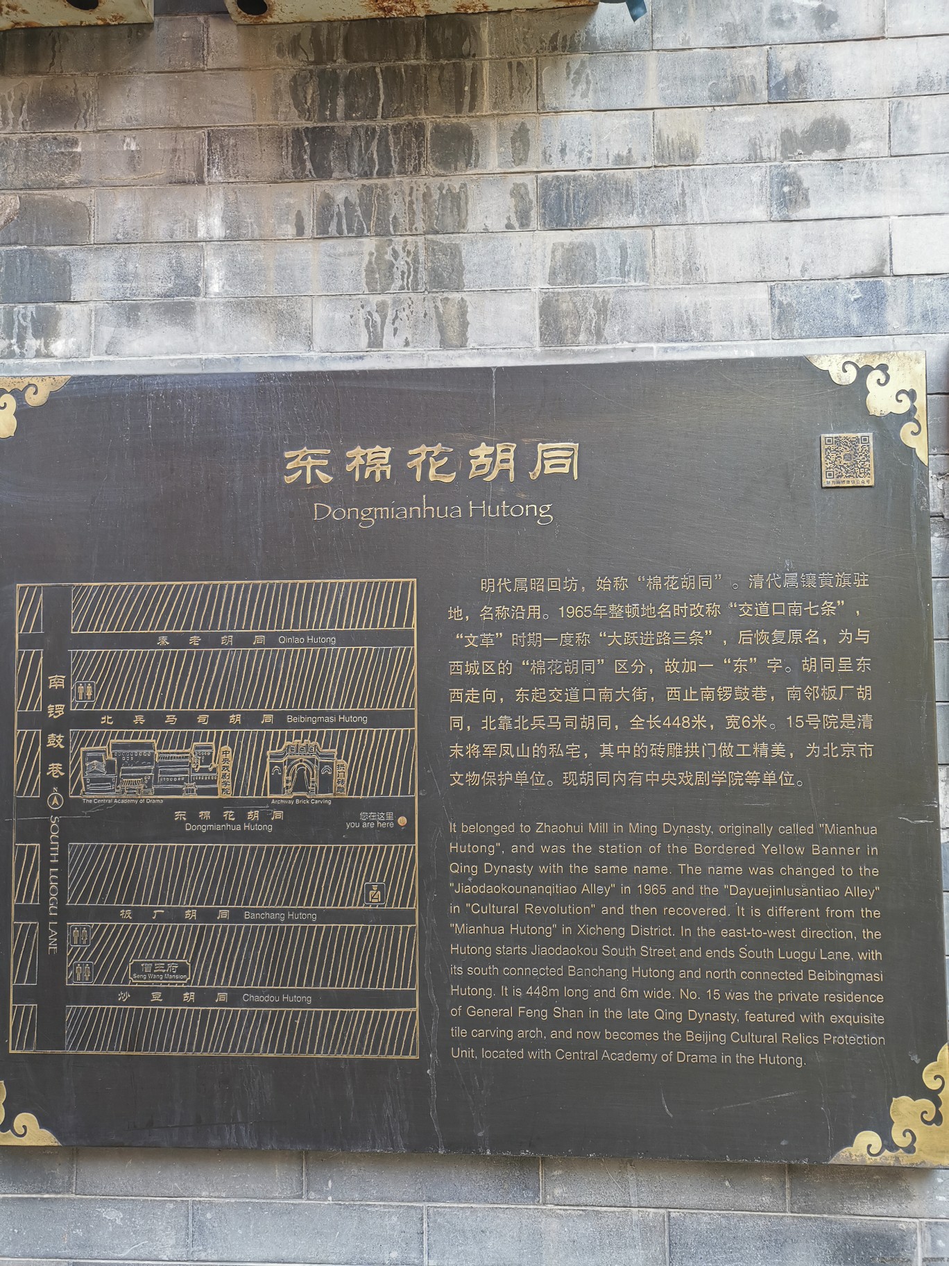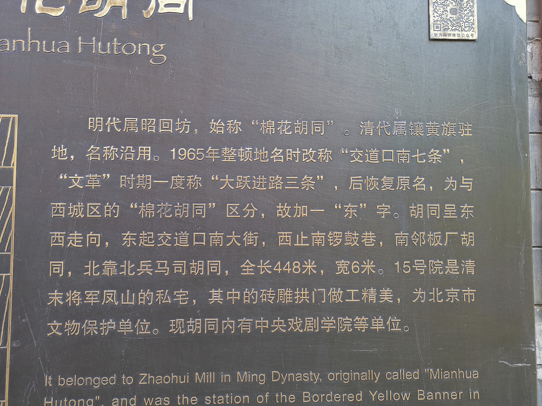 附近有东棉花胡同,明代属昭回坊,清代是镶黄旗驻地,15号院是清末将军凤山的宅院。