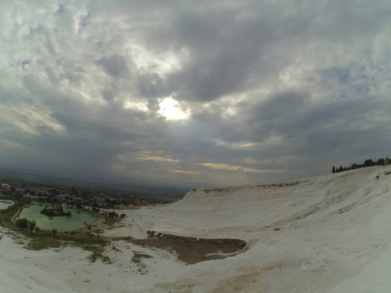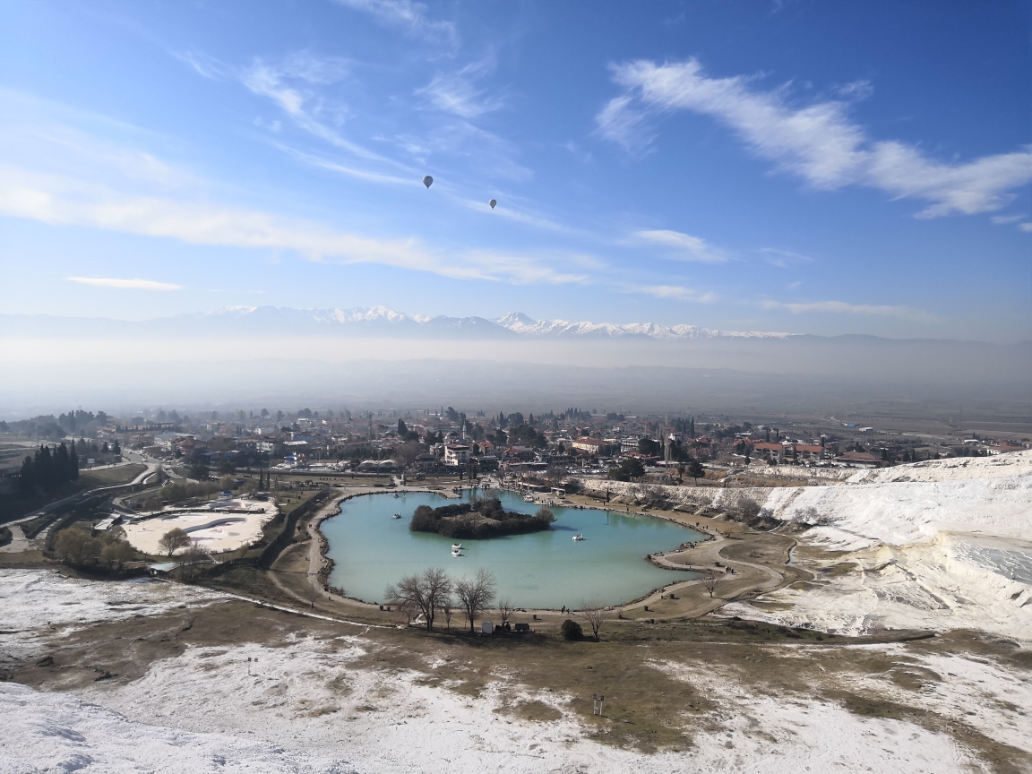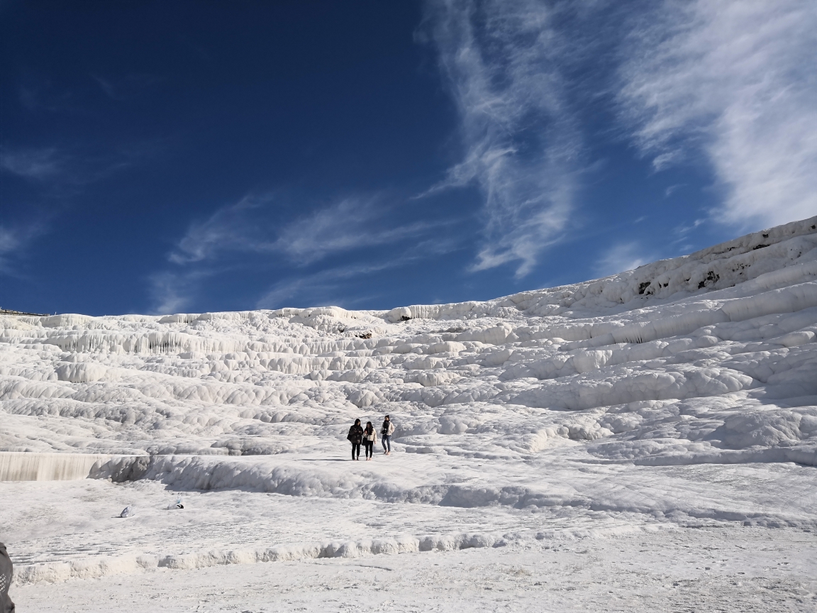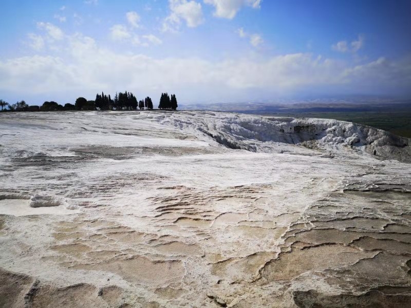 ,因其一层层亮闪闪的白色钙华温泉池形似棉花而得其名。池水很浅,你可以直接下去感受一下,但要注意安全,因为有点滑。池水上方有个古游泳池,水中淹没着一些古代的大理石圆柱,你可以在里面游泳体验,很有复古的滋味。