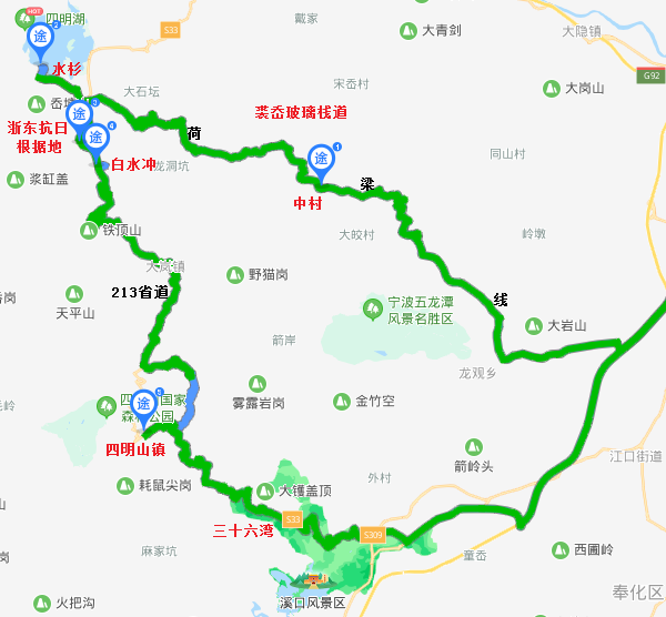 第二次是走四明山大环线:路线为鄞江→樟村→中村(过鹿亭上庄右转几公里就是裘岙玻璃栈道,免费的)→梁弄(四明湖、浙东抗日根据地旧址、白水冲)→213省道→四明山镇(黄羲之纪念馆、镇东桥)→三十六湾高山花园村→鄞江。