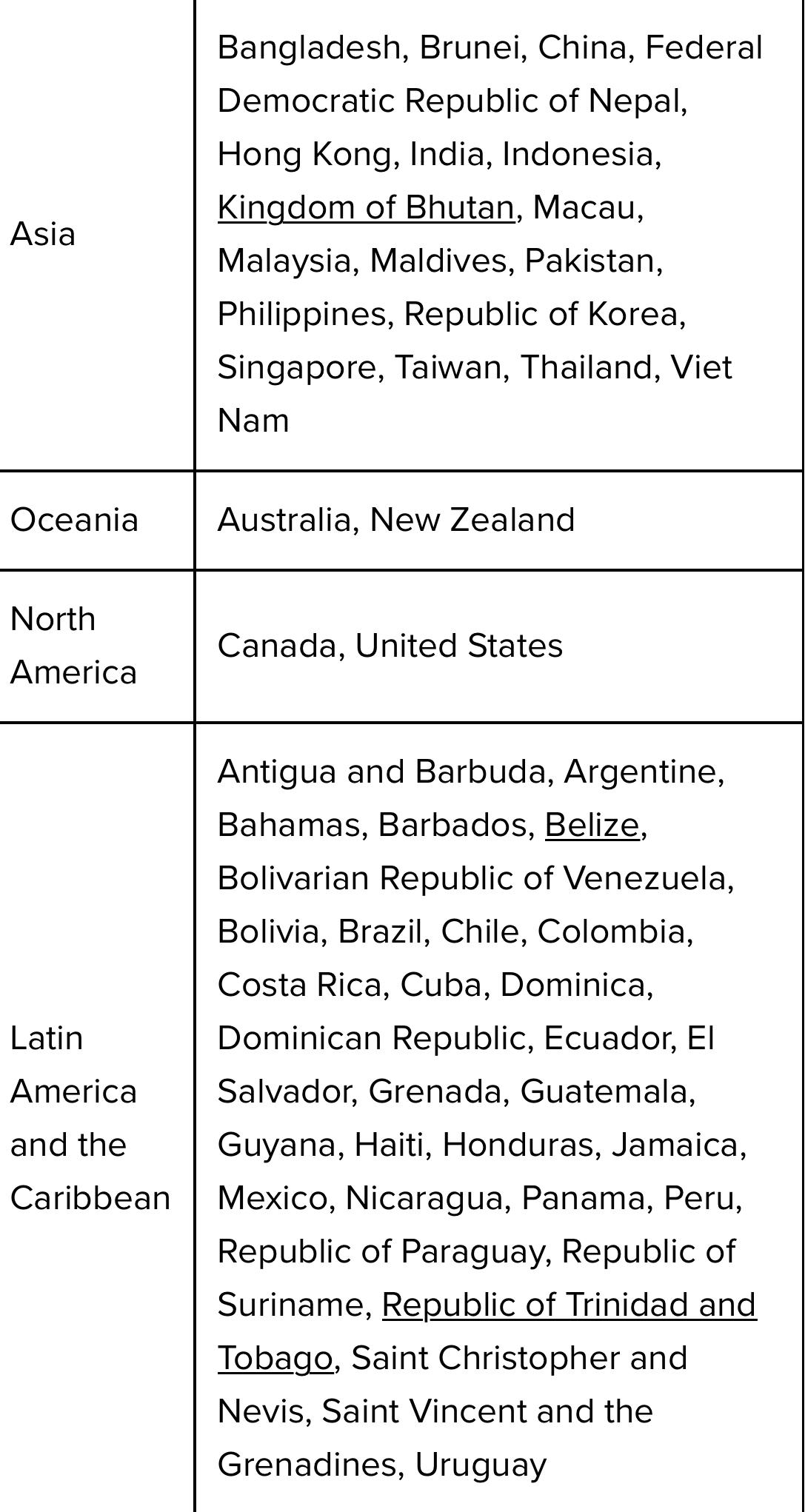 一、亚洲:印度尼西亚、新加坡、泰国、韩国、中国(含港澳台地区)、菲律宾、文莱、越南、马来西亚。
