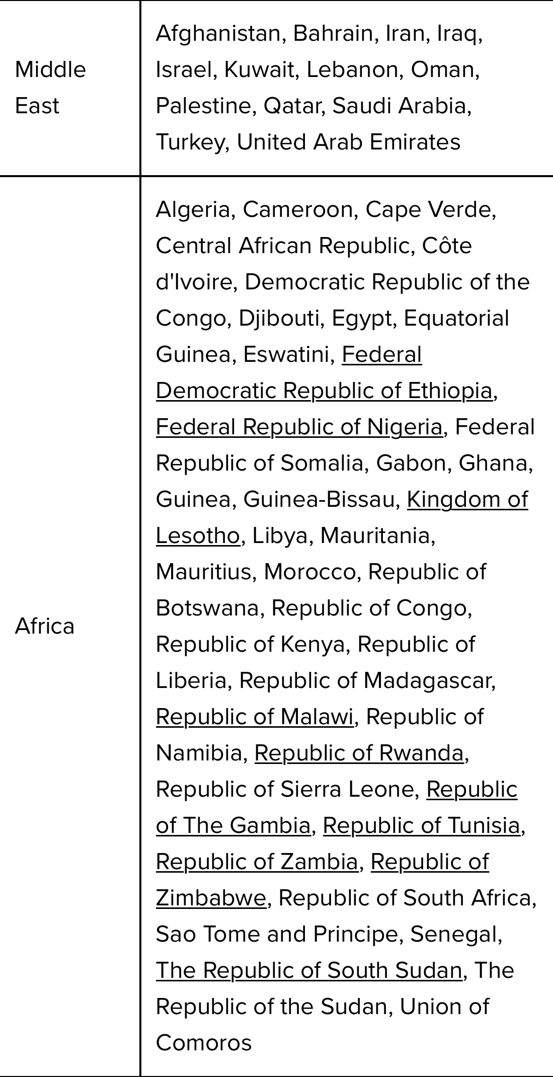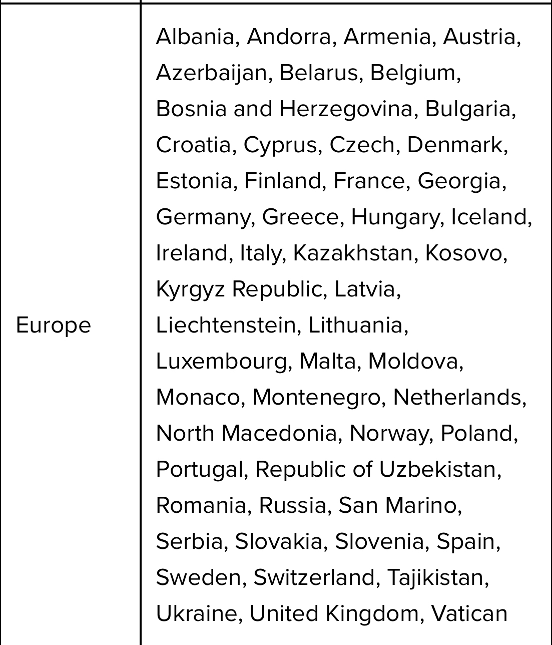 五、欧州:冰岛、爱尔兰、阿尔巴尼亚、亚美尼亚、安道尔、意大利、英国、爱沙尼亚、奥地利、荷兰、北马其顿、塞浦路斯、希腊、克罗地亚、圣马力诺、瑞士、瑞典、西班牙、斯洛文尼亚、斯洛伐克、塞尔维亚、捷克、丹麦、德国、挪威、梵蒂冈、匈牙利、芬兰、法国、保加利亚、比利时、波兰、波黑、葡萄牙、马耳他、摩纳哥、摩尔多瓦、拉脱维亚、立陶宛、列支敦士登、罗马尼亚、卢森堡。