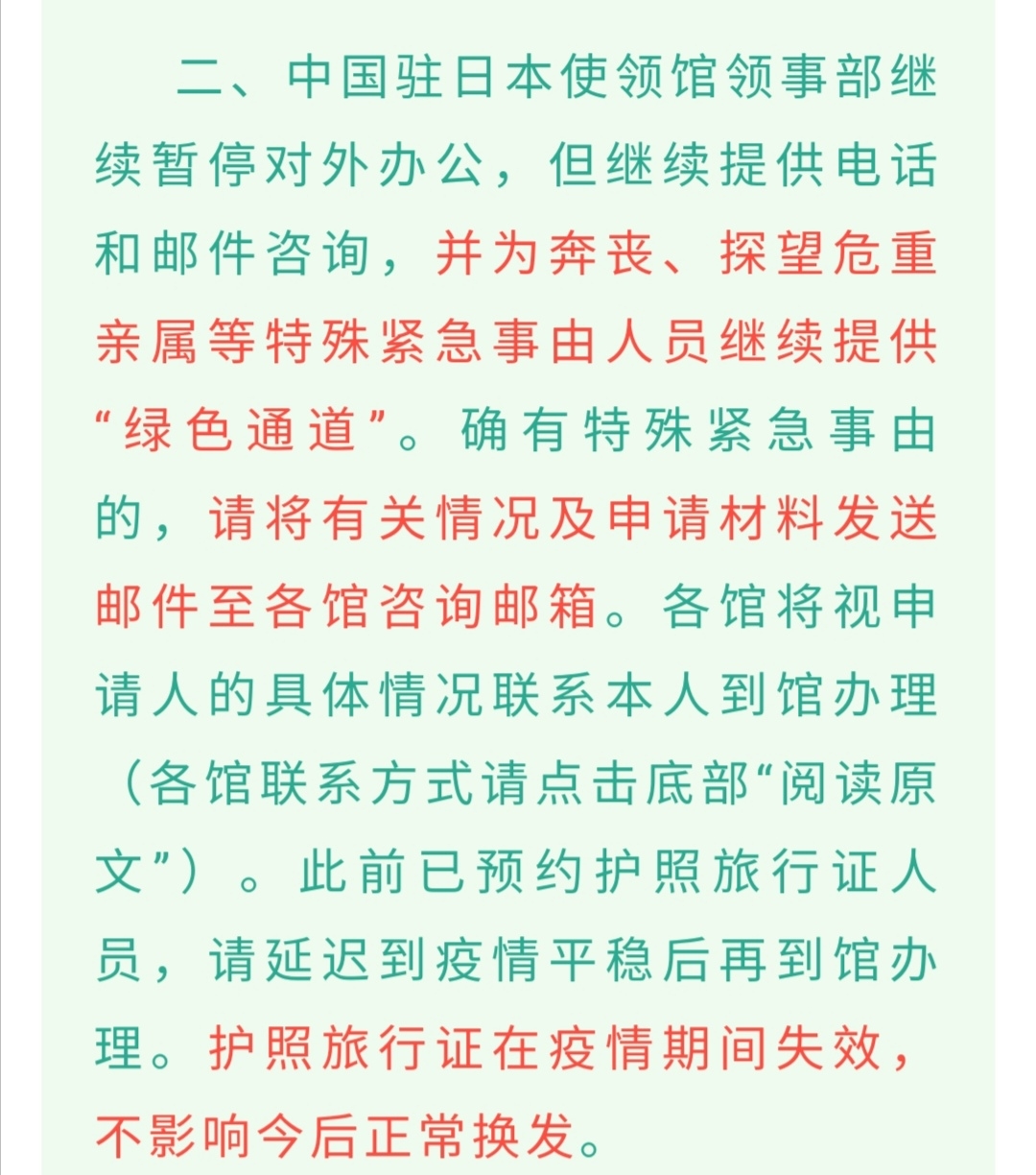 中国驻日本大使馆领事业务电话及邮箱:03-3403-3065/3064内线703(领事协助)、03-3403-5633内线701、702(护照、公认证),邮箱japan12308@163.com。