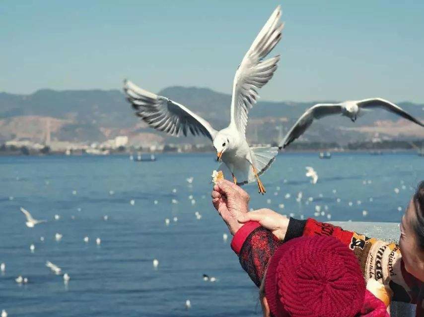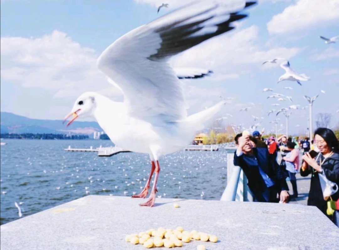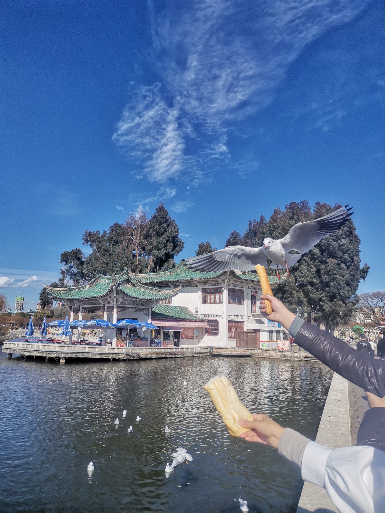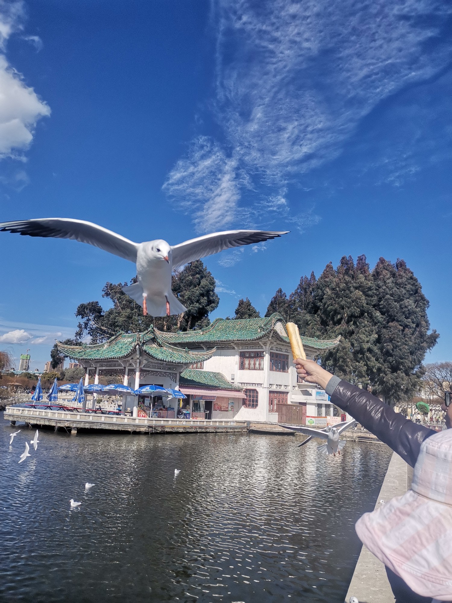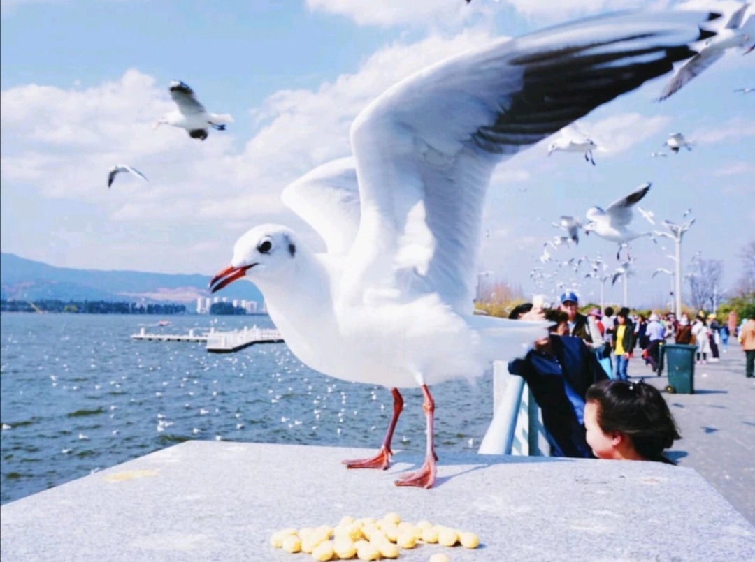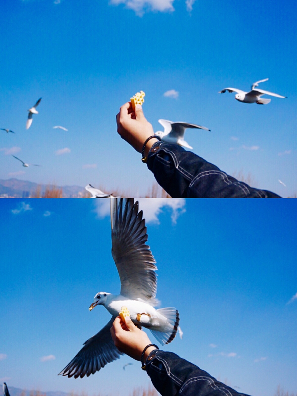 可以准备一些饼干或者面包,放手里,把手伸过去海鸥就会来吃,还可以趁机拍照。滇池边风大,记得多带一件外套哦!