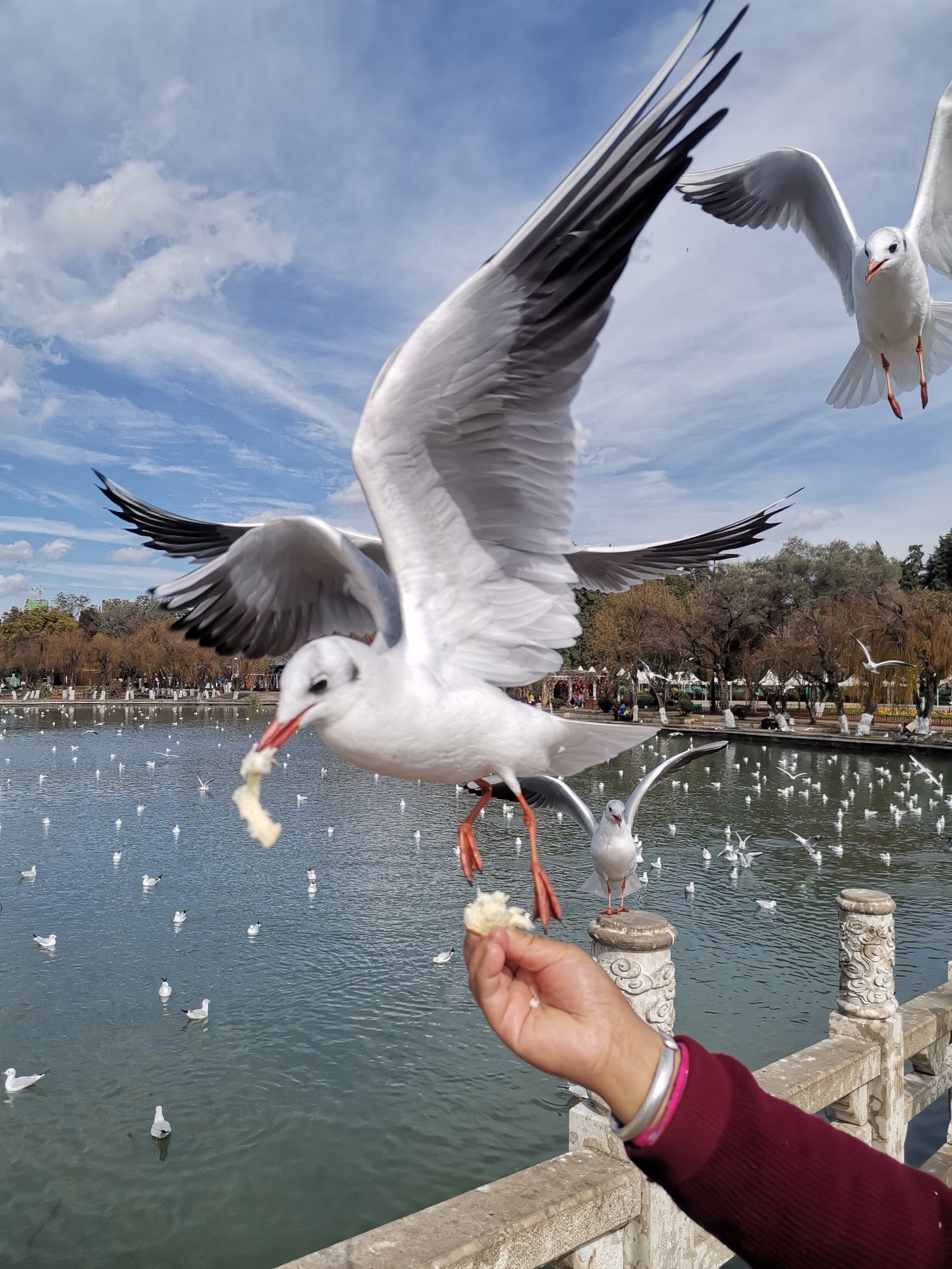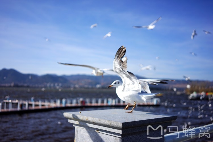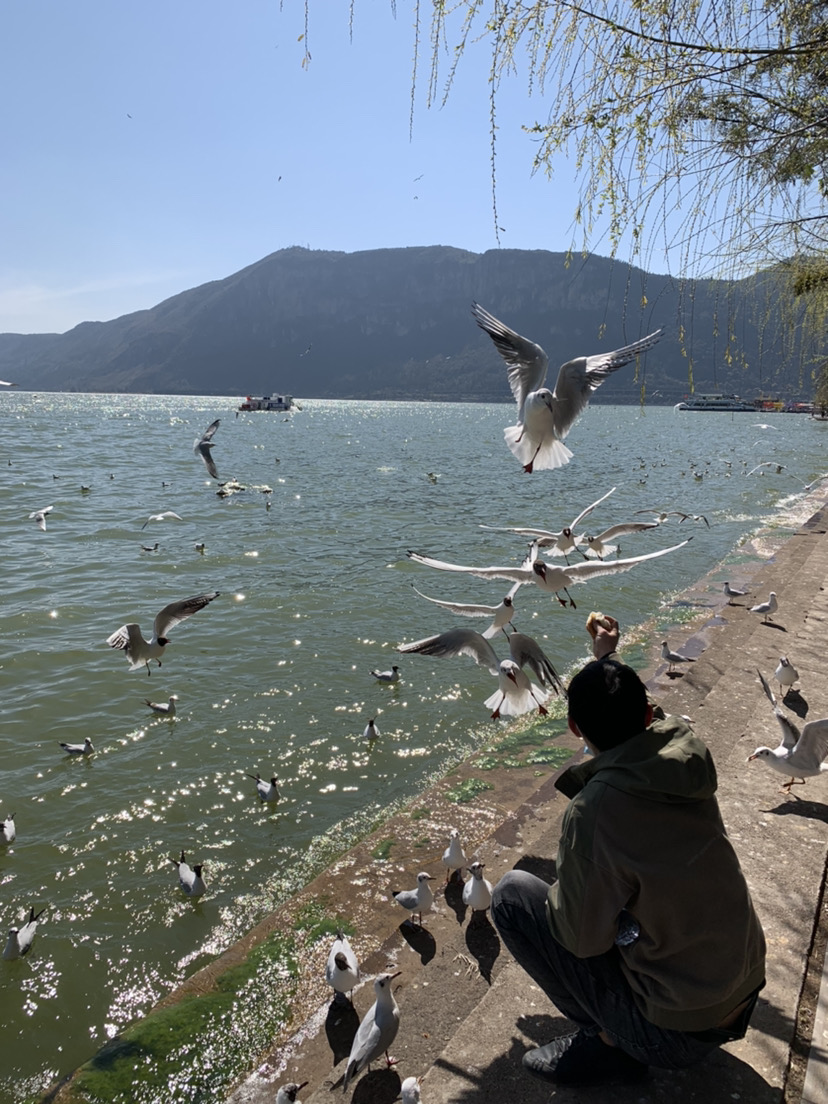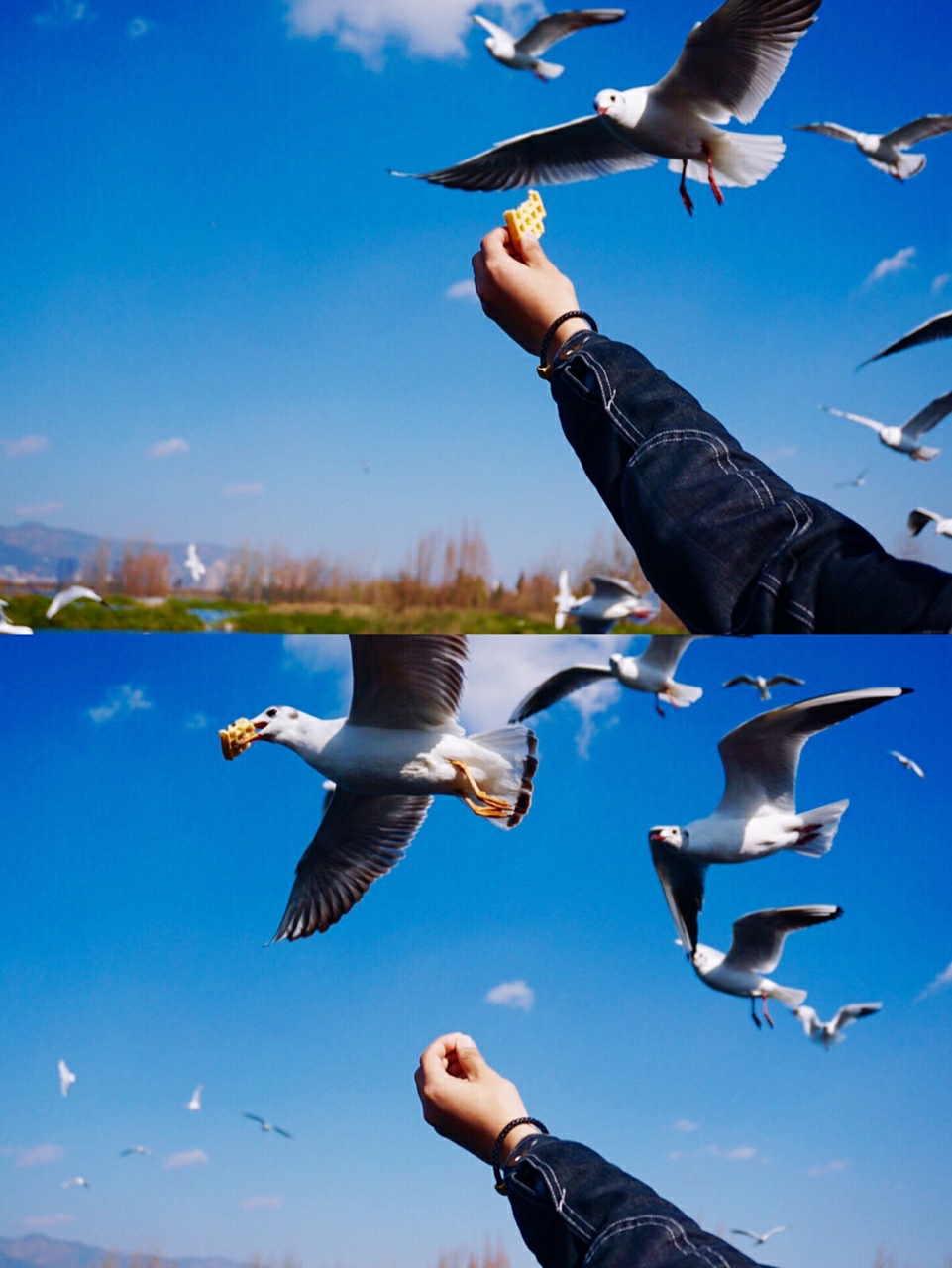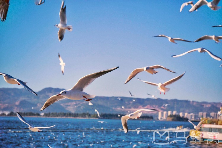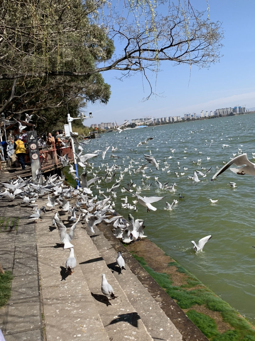 可以准备一些饼干或者面包,放手里,把手伸过去海鸥就会来吃,还可以趁机拍照。滇池边风大,记得多带一件外套哦!
