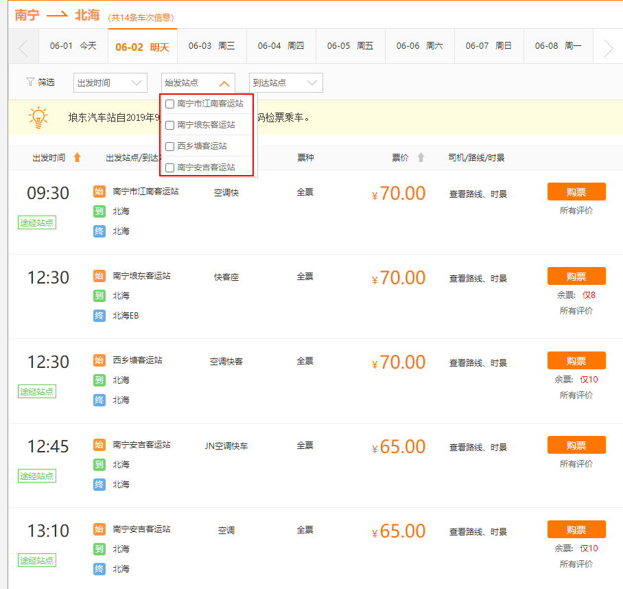 [题主采纳]南宁东西南北四个方位各有一个客运站有去北海的大巴,而且四个站均离地铁站很近,如果题主准备坐大巴去的话可以结合大巴时刻表以及所在方位就近选择,时刻表可在畅途网、携程等查询,题主也可以选择高铁出行,在南宁东站乘高铁前往北海。========== 如果你觉得TA的回答不错,快来给TA点个赞吧! 你...显示全部