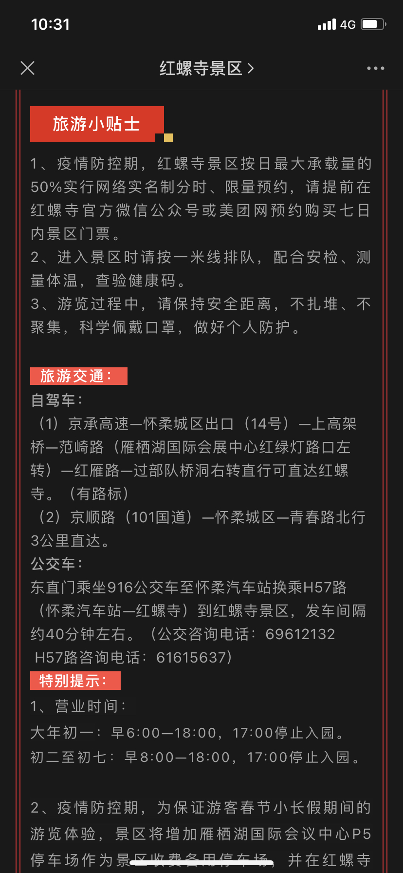 春节小长假期间,红螺寺景区严格执行预约、限量等防控管理措施:一、营业时间:大年初一: 早6:00—18:00, 17:00停止售票。初二—初七:早8:00—18:00, 17:00停止售票。二、预约购票:疫情防控期,红螺寺景区按日最大承载量的50%实行网络实名制分时、限量预约,请...显示全部