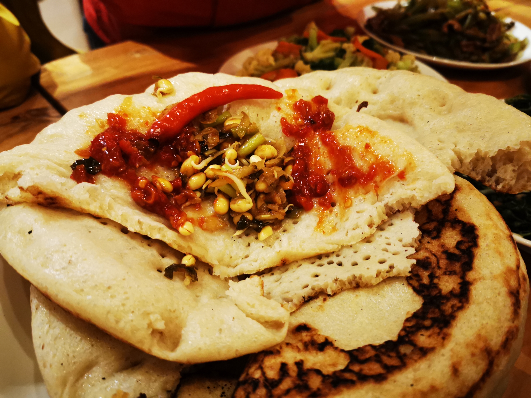 小米烙饼上放菜,再抹点辣椒酱,这个味儿,啧啧,相当好吃