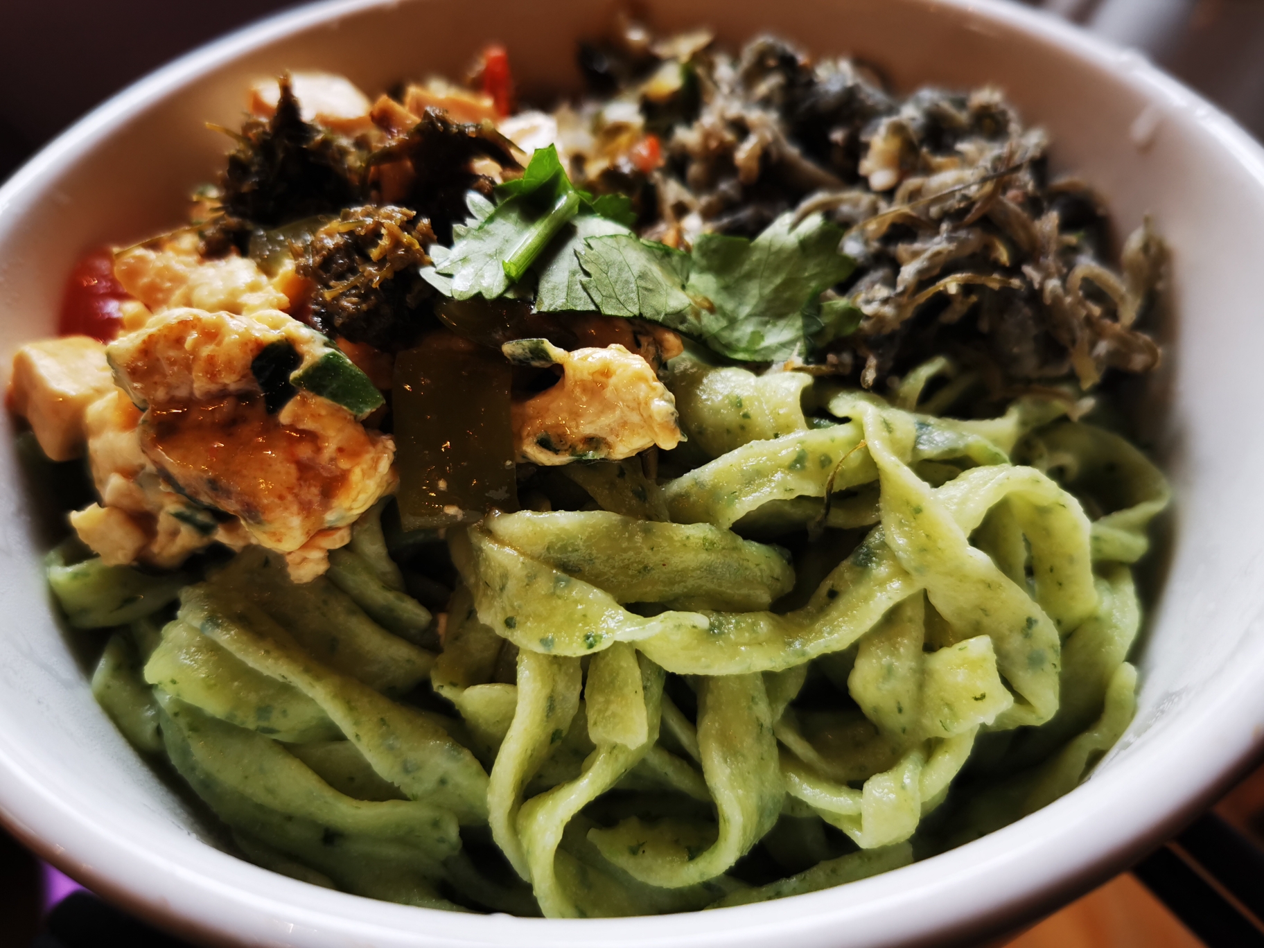 菠菜打卤面,还有好多味碟可以随机调味。怎么调都好吃