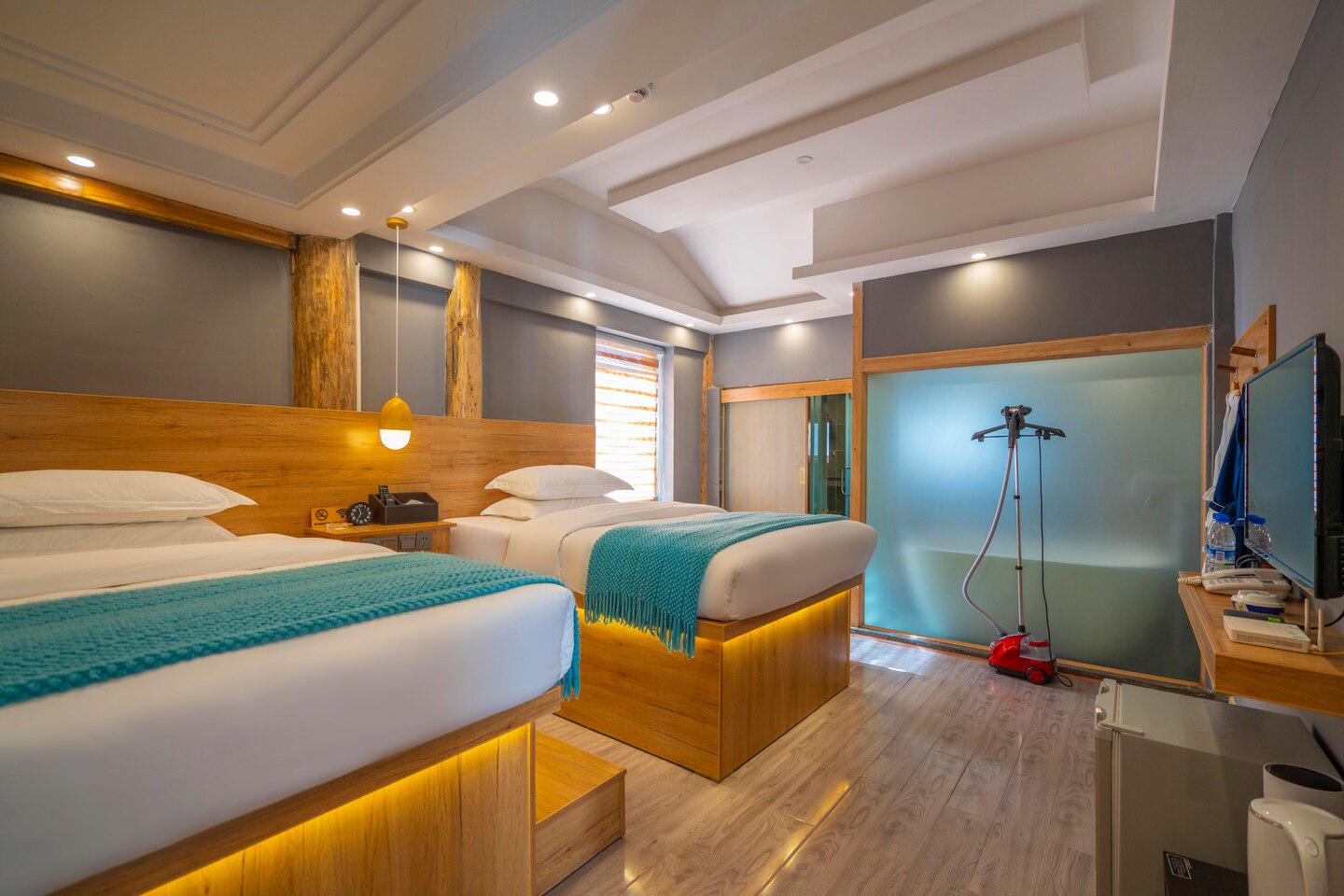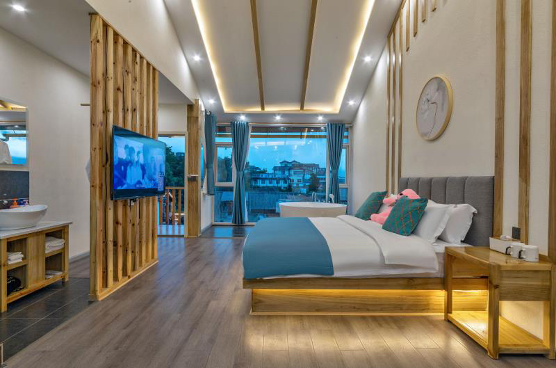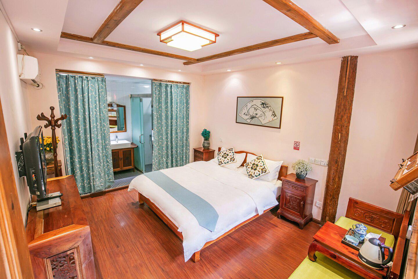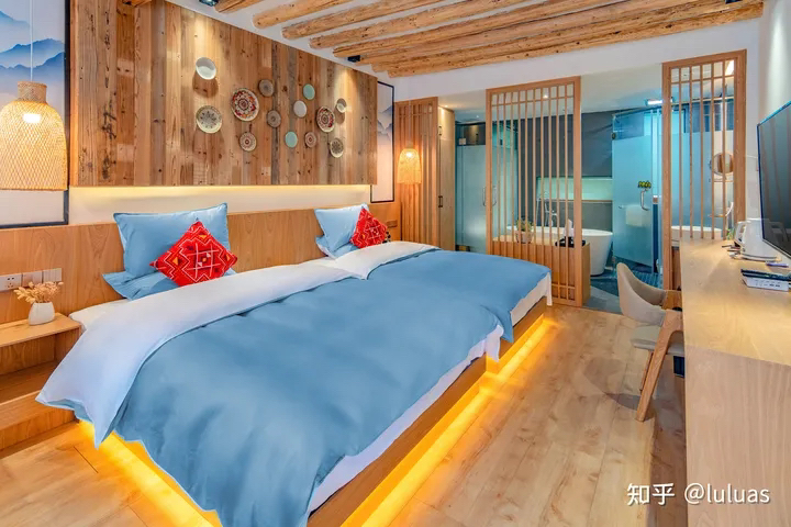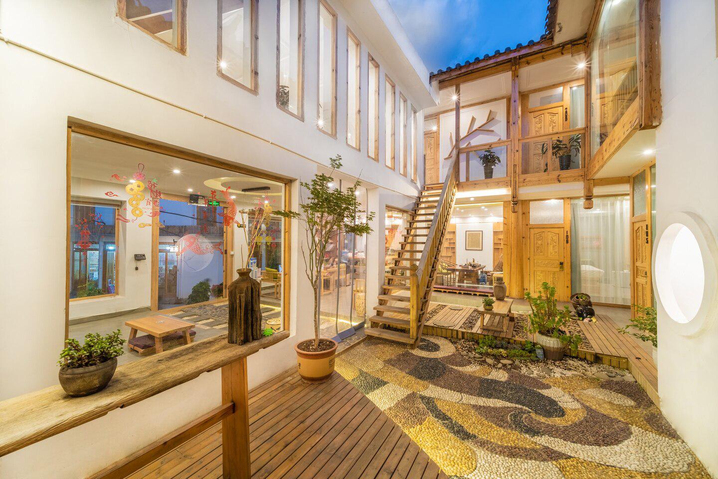 古城的网红民宿,就像是现代与古代的穿越,大大的院落院内空间面积很大,拥有大堂,茶室,休闲区,观景露台,观景花园等。院内各处皆景,水池游鱼,花丛似景,石铺小路,原木桌椅,绿植覆满。美的就像来到了大自然。房间超大空间享受,房间风格以欢快,色彩格调,清洗气息为主,满眼都是爱的泡泡,打开天窗就是