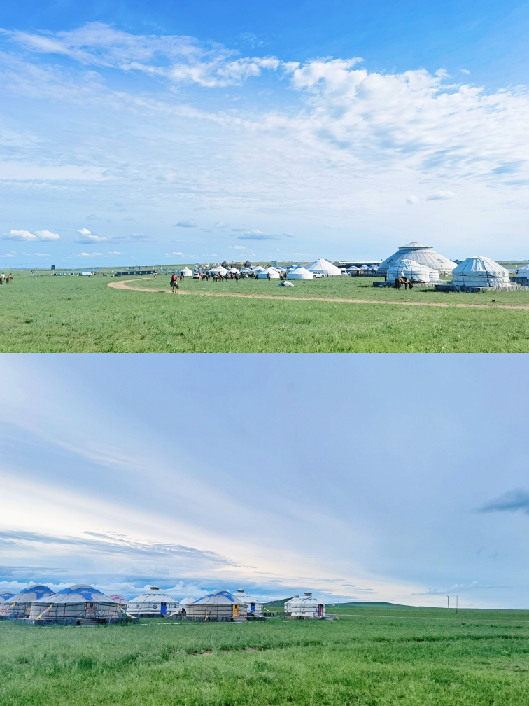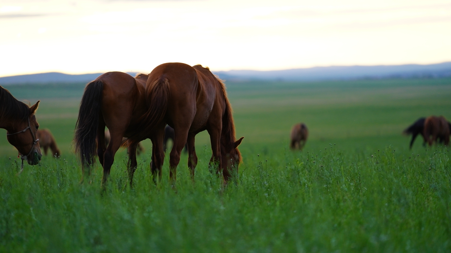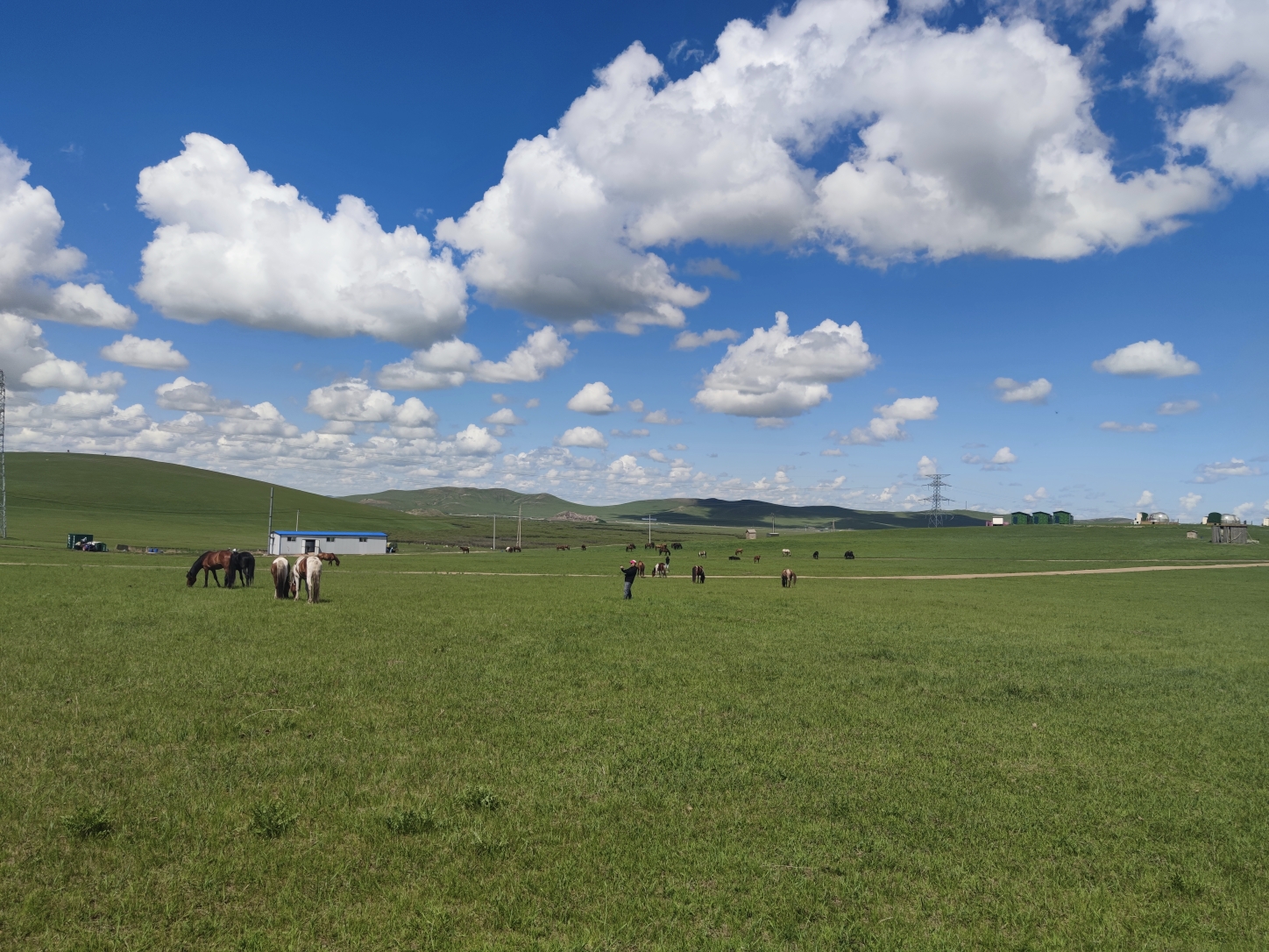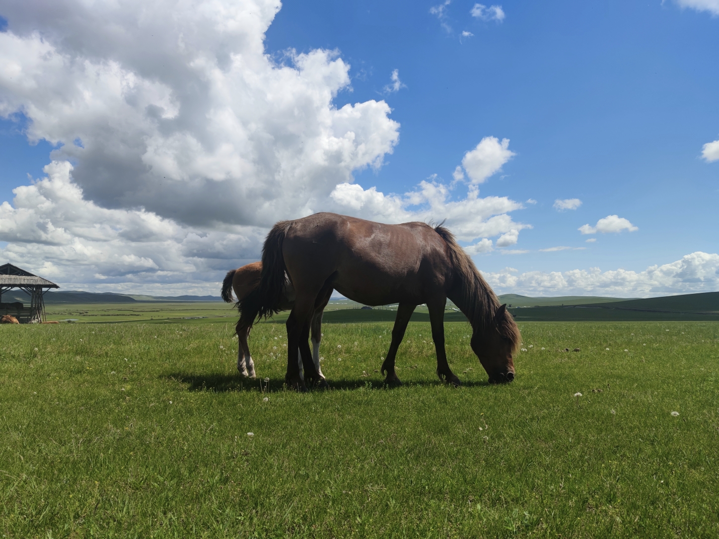 草原上的白云朵朵,治好颈椎病;随手一拍,远方的散步的骏马就是一张大美图。