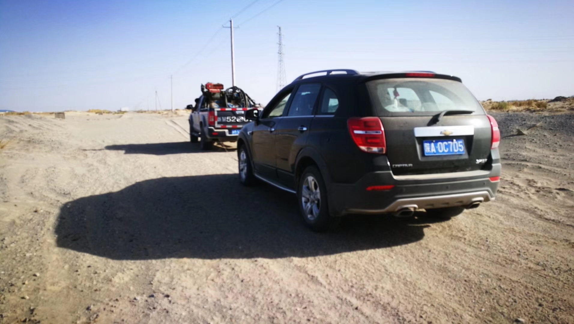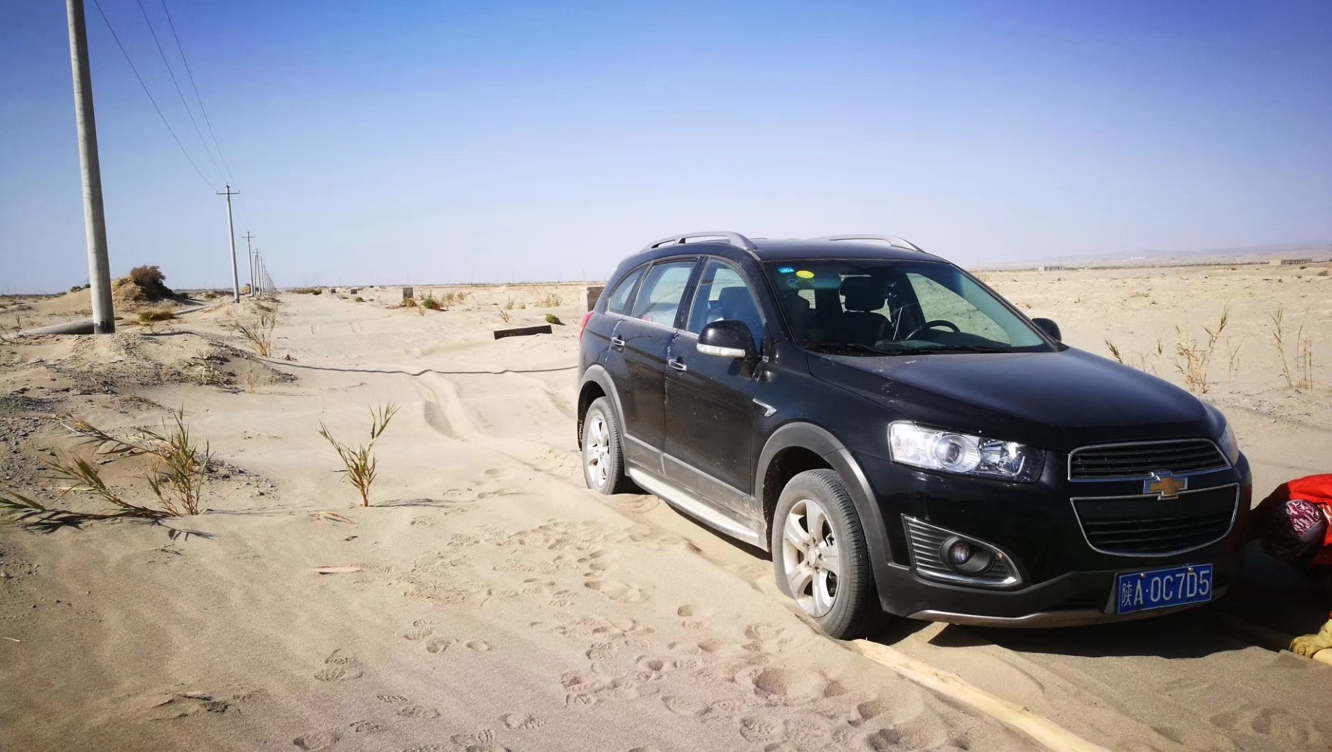 顶着下午四点多钟酷热的太阳我来到公路边,拦了几辆车都不太适合拖车,最后一辆四驱越野工程车进入了视线。司机是汉族小伙子,车上还带着他四、五岁的小女儿,跟他一说情况,小伙子二话没说就让我上车,并告诉我说罗布泊大峡谷其实就在前方2公里处,额滴个神啊。