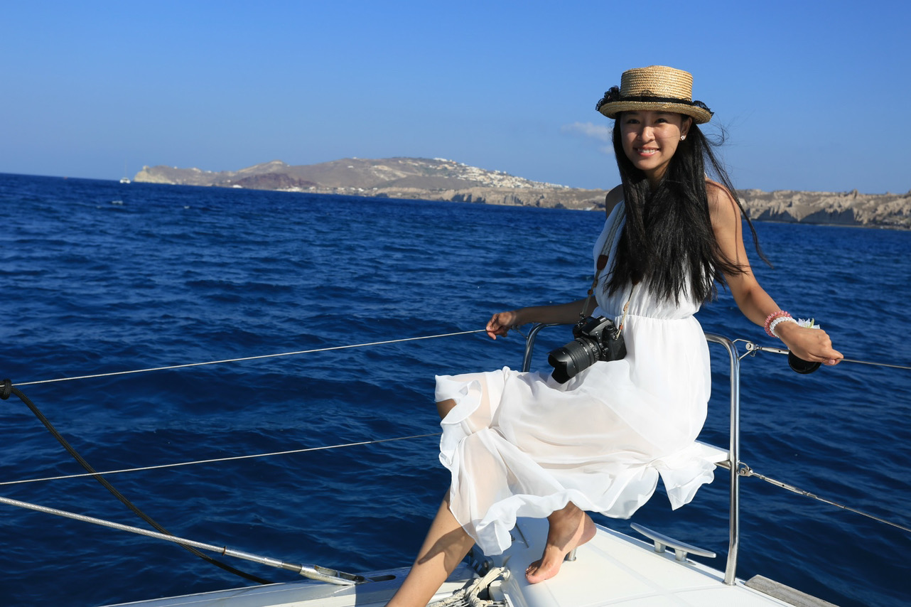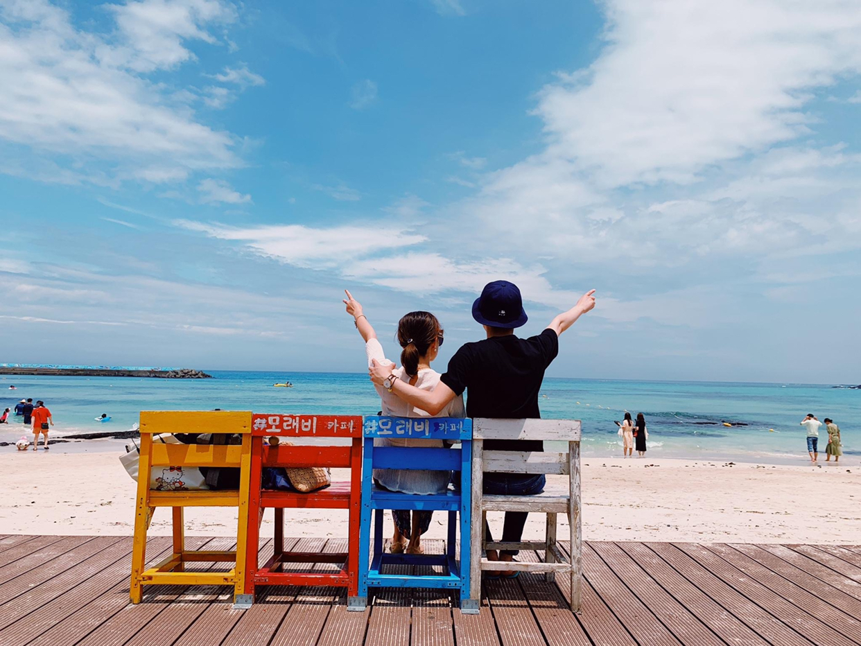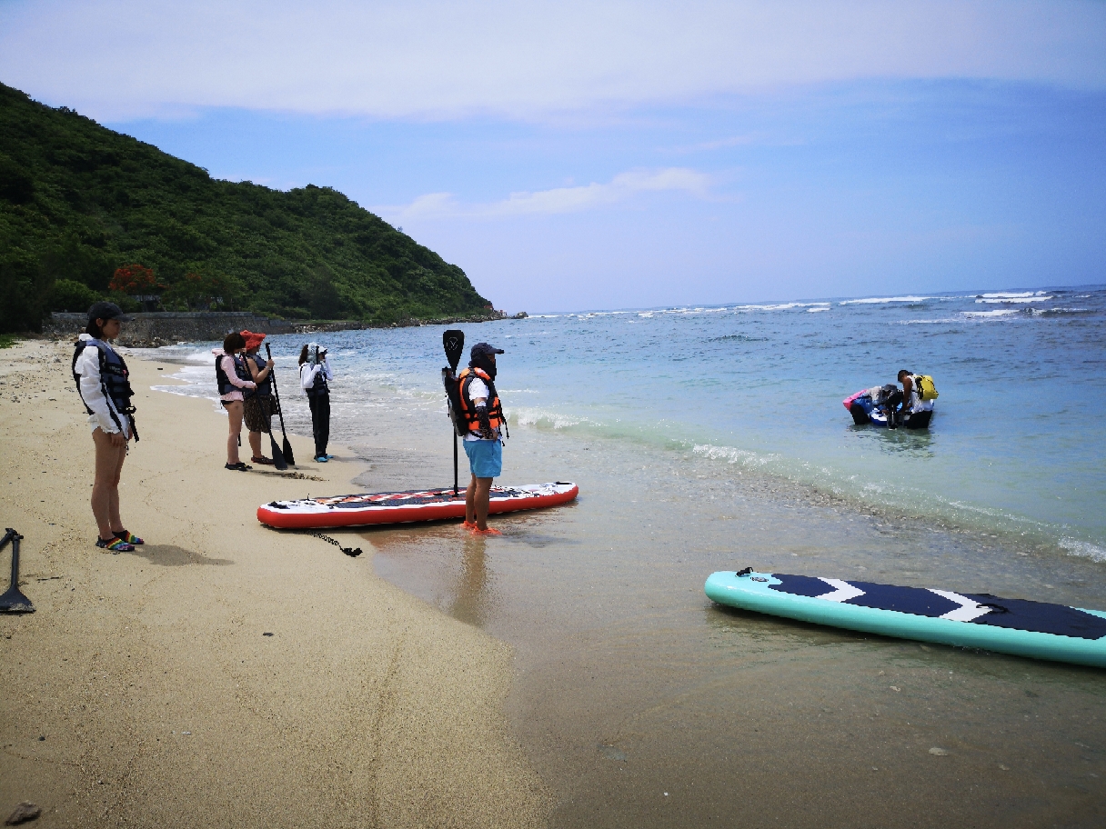 大东海呈月牙形的海湾,海水由近而远碧绿湛蓝、晶莹如镜,倒映着蓝天、白云和岱山。远处海天一色,岸边浪花往复,海面游艇点点。阳光、碧水、沙滩、绿树构成了一幅美丽的热带风光画面。