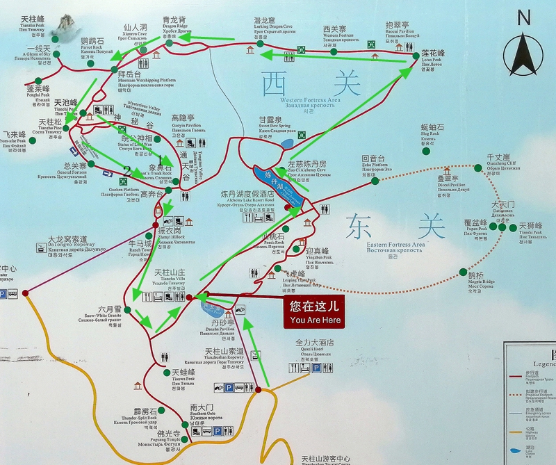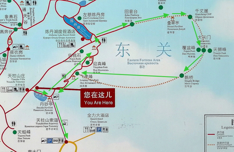 第一天(绿色箭头部分):天柱山庄—炼丹湖—莲花峰—西关寨—青龙背—仙人洞—拜岳台—天池峰—百步云梯—总关寨(或者—神秘谷—通天谷)—振衣岗—六月雪—天柱山庄,这样正好是一个环线。