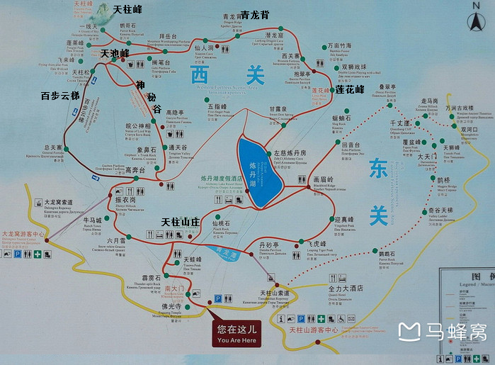 如果不住山上,那么第一天可以从大龙窝索道上山,走西关后坐天柱山索道或徒步下山;第二天坐天柱山索道上去玩东关。
