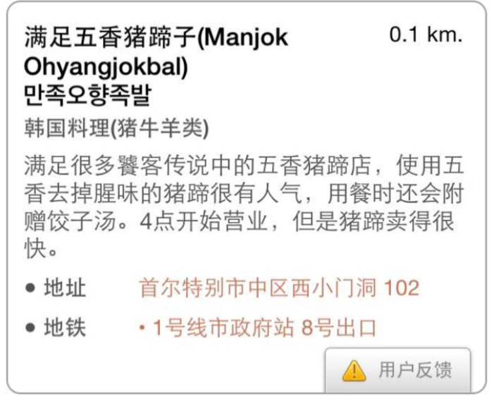 网上这么多仇视中国人的韩国键盘侠,让我以为韩国人都很排中,但是到了那里才知道,热情的韩国人很多。比如我第二次去首尔,要在市厅附近找一家叫满足五香猪蹄的美食店,但是拿着地址离着仅百米的距离就是找不到(下图是当时截屏),求助路上一位上班族美眉,她英语很一般,就看到了几个韩文知道了我在找什么地方,非...显示全部
