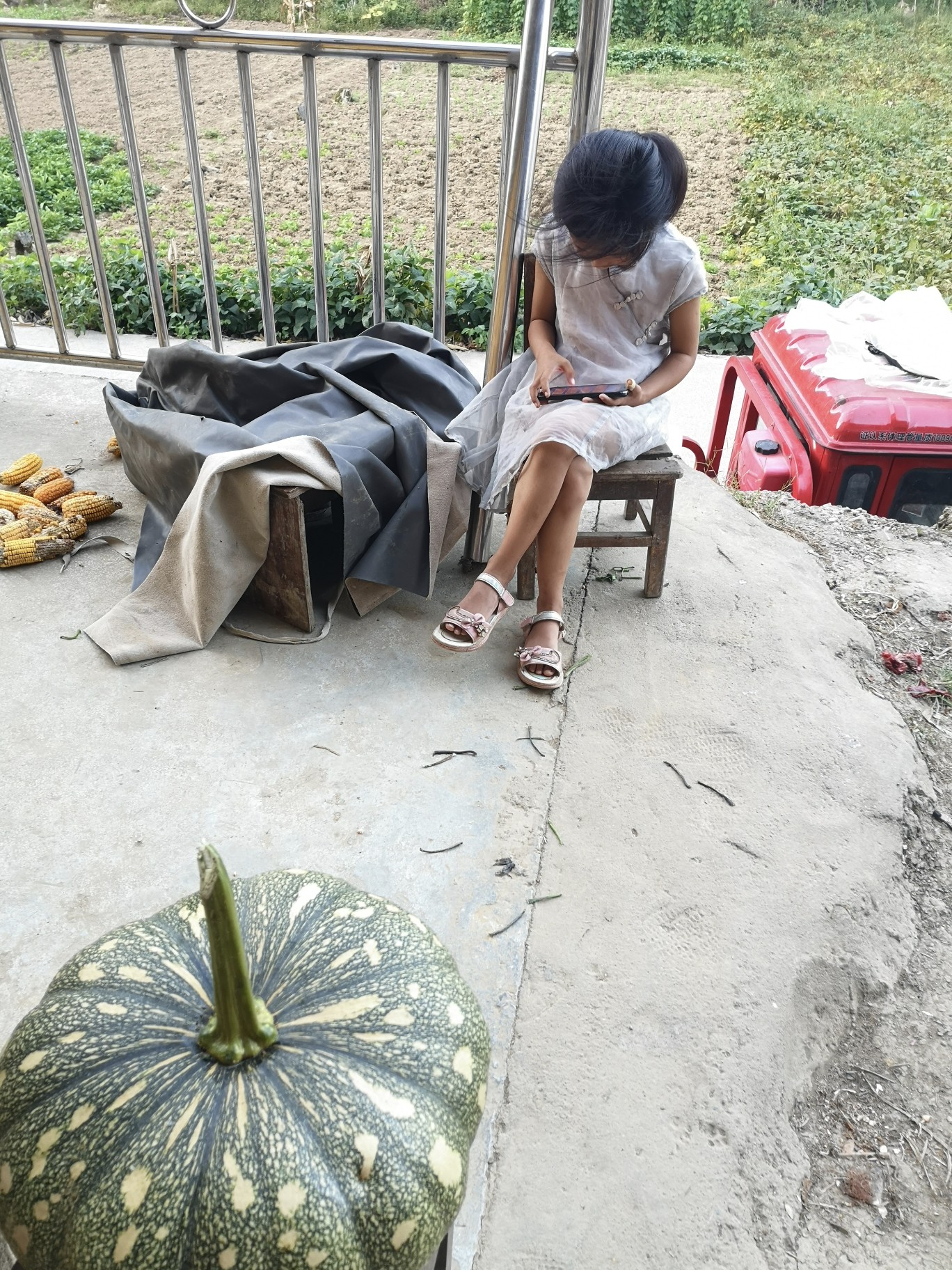 国庆节乡村小女孩静坐朗读。