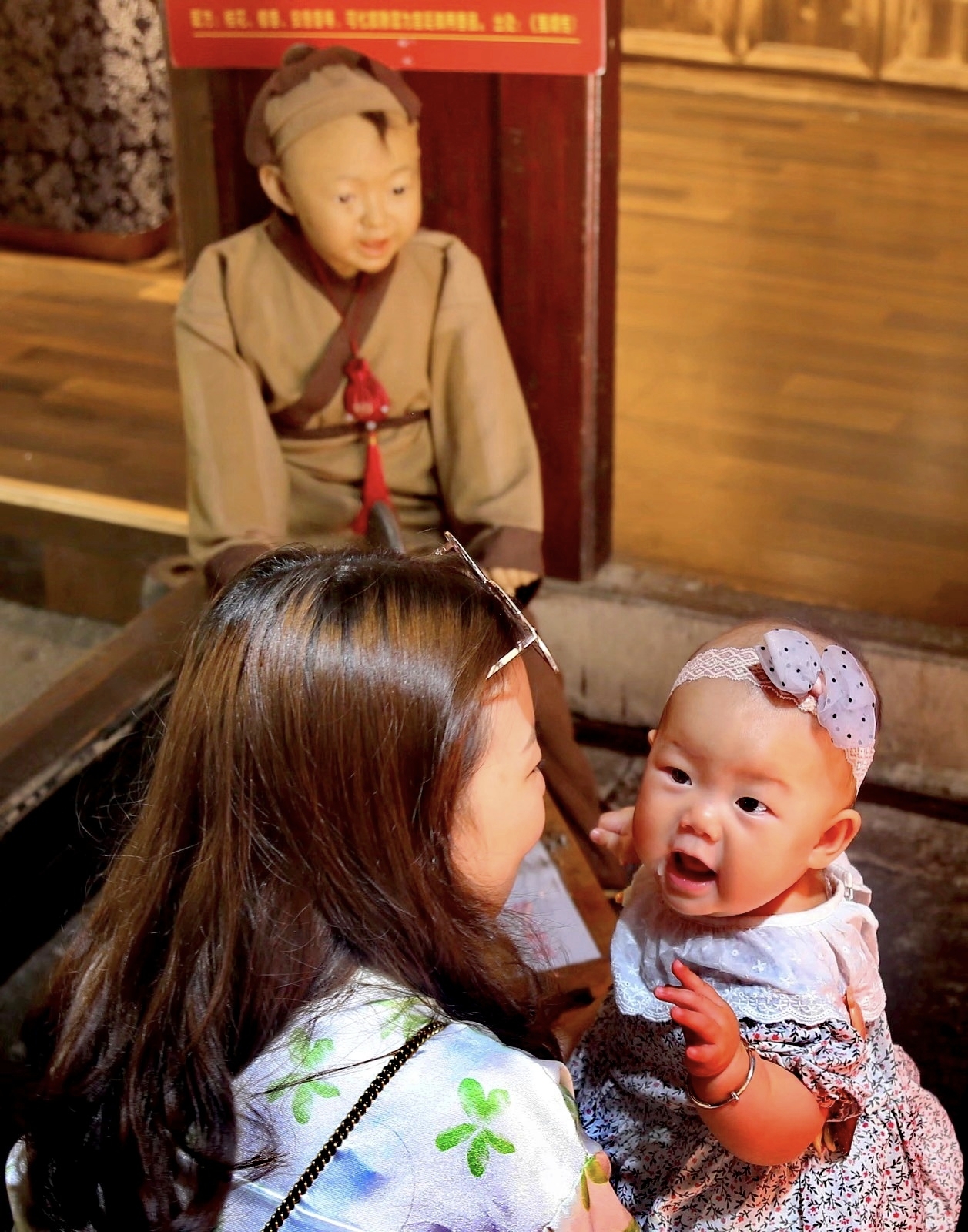 给一个娃拍照,孩子很幸福,偎依在妈的怀抱里,如果是单纯拍娃就意思不大,正好古街旁有一个正在干活的童偶,和娃的形象产生关联,劳作和幸福的对比,这样画面就有故事,我觉得这样拍就好一些。再