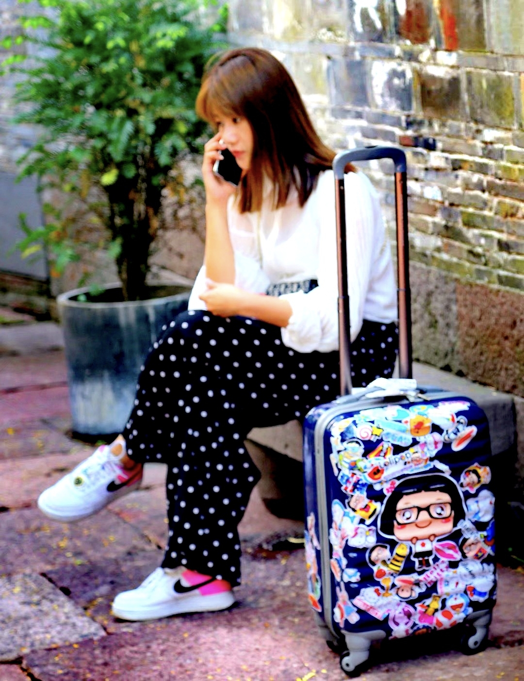 在路边小憩的拉杆箱女孩,特别是箱子上的卡通画面,这种画面组合很有趣。